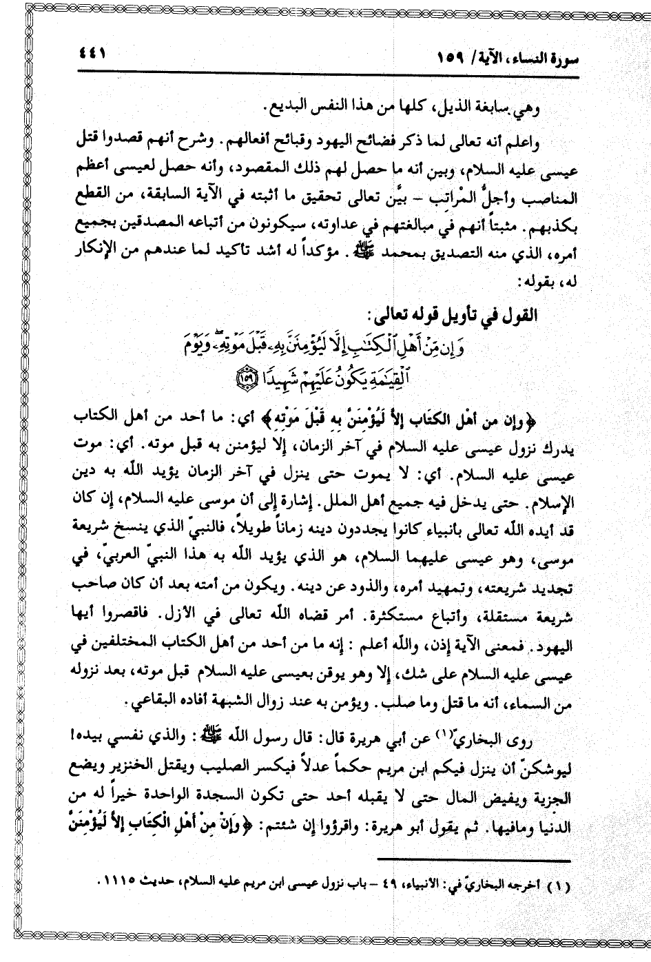 وَإِنْ مِنْ أَهْلِ الْكِتابِ إِلاَّ لَيُؤْمِنَنَّ بِهِ قَبْلَ مَوْتِهِ وَيَوْمَ الْقِيامَةِ يَكُونُ عَلَيْهِمْ شَهِيداً (159)