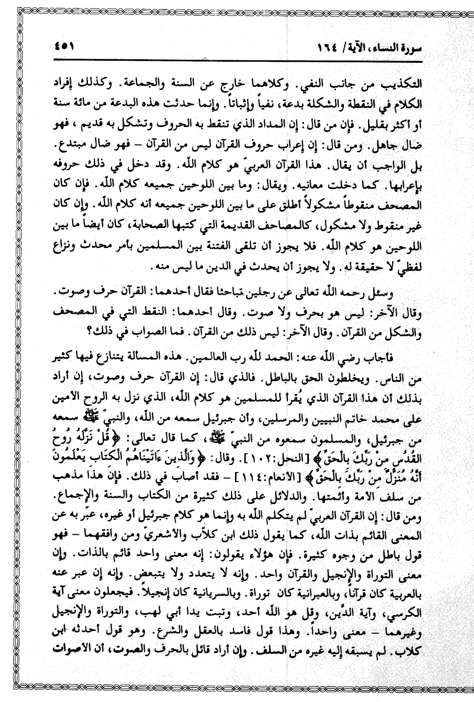 ومن قال: إن القرآن العربيّ لم يتكلم الله به وإنما هو كلام جبرئيل أو غيره، عبّر به عن المعنى القائم بذات الله، كما يقول ذلك ابن كلّاب والأشعريّ ومن وافقهما- فهو قول باطل من وجوه كثيرة. فإن هؤلاء يقولون: إنه معنى واحد قائم بالذات. وإن معنى التوراة والإنجيل والقرآن واحد. وإنه لا يتعدد ولا يتبعض. وإنه إن عبر عنه بالعربية كان قرآنا، وبالعبرانية كان توراة. وبالسريانية كان إنجيلا. فيجعلون معنى آية الكرسي، وآية الدّين، وقل هو الله أحد، وتبت يدا أبي لهب، والتوراة والإنجيل وغيرهما- معنى واحدا. وهذا قول فاسد بالعقل والشرع. وهو قول أحدثه ابن كلاب. لم يسبقه إليه غيره من السلف. وإن أراد قائل بالحرف والصوت، أن الأصوات