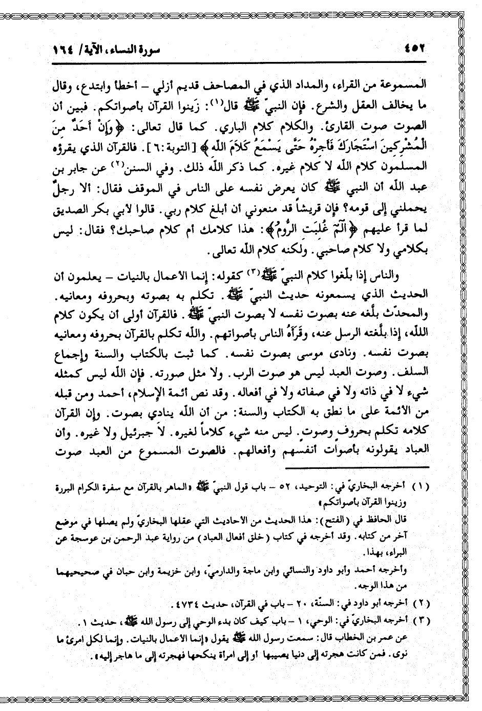 والمحدّث بلّغه عنه بصوت نفسه لا بصوت النبيّ صلى الله عليه وسلم. فالقرآن أولى أن يكون كلام الله، إذا بلّغته الرسل عنه، وقرأه الناس بأصواتهم. والله تكلم بالقرآن بحروفه ومعانيه بصوت نفسه. ونادى موسى بصوت نفسه. كما ثبت بالكتاب والسنة وإجماع السلف. وصوت العبد ليس هو صوت الرب. ولا مثل صورته. فإن الله ليس كمثله شيء لا في ذاته ولا في صفاته ولا في أفعاله. وقد نص أئمة الإسلام، أحمد ومن قبله من الأئمة على ما نطق به الكتاب والسنة: من أن الله ينادي بصوت. وإن القرآن كلامه تكلم بحروف وصوت. ليس منه شيء كلاما لغيره. لا جبرئيل ولا غيره. وأن العباد يقولونه بأصوات أنفسهم وأفعالهم. فالصوت المسموع من العبد صوت