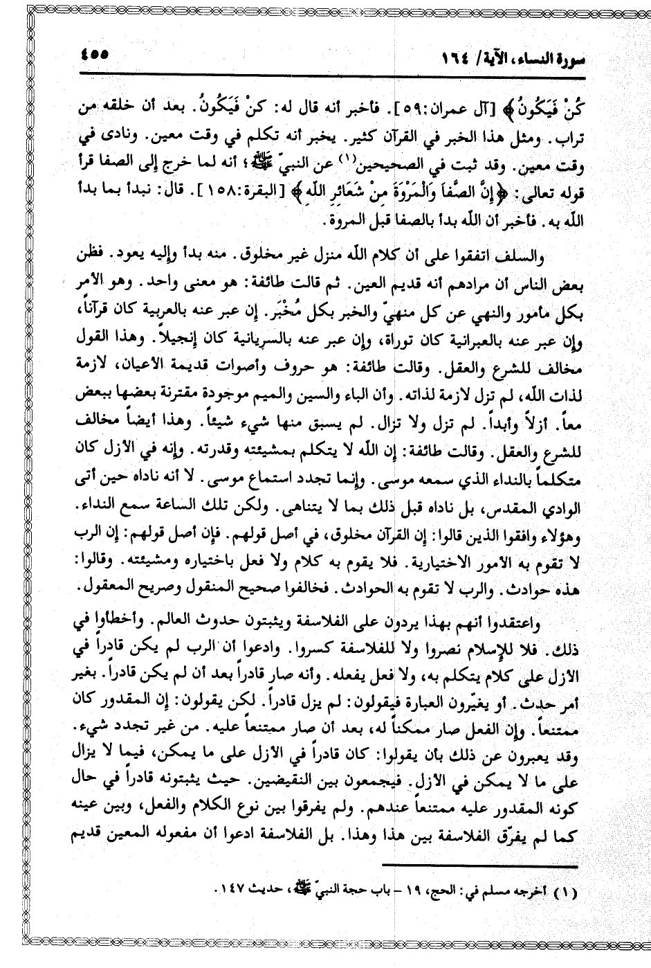 والسلف اتفقوا على أن كلام الله منزل غير مخلوق. منه بدأ وإليه يعود. فظن بعض الناس أن مرادهم أنه قديم العين. ثم قالت طائفة: هو معنى واحد. وهو الأمر بكل مأمور والنهي عن كل منهيّ والخبر بكل مخبر. إن عبر عنه بالعربية كان قرآنا، وإن عبر عنه بالعبرانية كان توراة، وإن عبر عنه بالسريانية كان إنجيلا. وهذا القول مخالف للشرع والعقل. وقالت طائفة: هو حروف وأصوات قديمة الأعيان، لازمة لذات الله، لم تزل لازمة لذاته. وأن الباء والسين والميم موجودة مقترنة بعضها ببعض معا. أزلا وأبدا. لم تزل ولا تزال. لم يسبق منها شيء شيئا. وهذا أيضا مخالف للشرع والعقل. وقالت طائفة: إن الله لا يتكلم بمشيئته وقدرته. وإنه في الأزل كان متكلما بالنداء الذي سمعه موسى. وإنما تجدد استماع موسى. لا أنه ناداه حين أتى الوادي المقدس، بل ناداه قبل ذلك بما لا يتناهى. ولكن تلك الساعة سمع النداء.