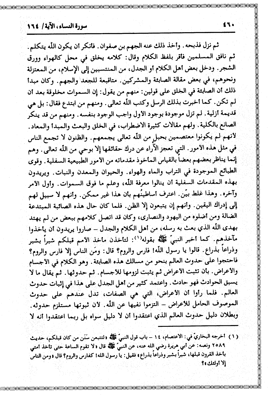 ثم نافق المسلمين فأقر بلفظ الكلام وقال: كلامه يخلق في محل كالهواء وورق الشجر. ودخل بعض أهل الكلام أو الجدل، من المنتسبين إلى الإسلام، من المعتزلة ونحوهم، في بعض مقالة الصابئة والمشركين. متعاقبة للجعد والجهم. وكان مبدأ ذلك أن الصابئة في الخلق على قولين: منهم من يقول: إن السموات مخلوقة بعد أن لم تكن. كما أخبرت بذلك الرسل وكتب الله تعالى. ومنهم من ابتدع فقال: بل هي قديمة أزلية. لم تزل موجودة بوجود الأول واجب الوجود بنفسه. ومنهم من قد ينكر الصانع بالكلية. ولهم مقالات كثيرة الاضطراب، في الخلق والبعث والمبدأ والمعاد.