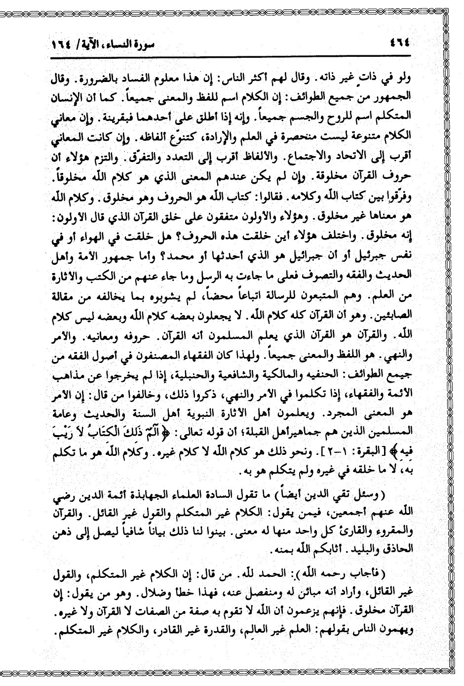 إنه مخلوق. واختلف هؤلاء أين خلقت هذه الحروف؟ هل خلقت في الهواء أو في نفس جبرئيل أو أن جبرائيل هو الذي أحدثها أو محمد؟ وأما جمهور الأمة وأهل الحديث والفقه والتصوف فعلى ما جاءت به الرسل وما جاء عنهم من الكتب والأثارة من العلم. وهم المتبعون للرسالة اتباعا محضا، لم يشوبوه بما يخالفه من مقالة الصابئين. وهو أن القرآن كله كلام الله. لا يجعلون بعضه كلام الله وبعضه ليس كلام الله. والقرآن هو القرآن الذي يعلم المسلمون أنه القرآن. حروفه ومعانيه. والأمر والنهي. هو اللفظ والمعنى جميعا. ولهذا كان الفقهاء المصنفون في أصول الفقه من جميع الطوائف: الحنفيه والمالكية والشافعية والحنبلية، إذا لم يخرجوا عن مذاهب الأئمة والفقهاء، إذا تكلموا في الأمر والنهي، ذكروا ذلك، وخالفوا من قال: إن الأمر هو المعنى المجرد. ويعلمون أهل الأثارة النبوية أهل السنة والحديث وعامة المسلمين الذين هم جماهير أهل القبلة أن قوله تعالى: الم ذلِكَ الْكِتابُ لا رَيْبَ فِيهِ [البقرة: 1- 2] . ونحو ذلك هو كلام الله لا كلام غيره. وكلام الله هو ما تكلم به، لا ما خلقه في غيره ولم يتكلم هو به.