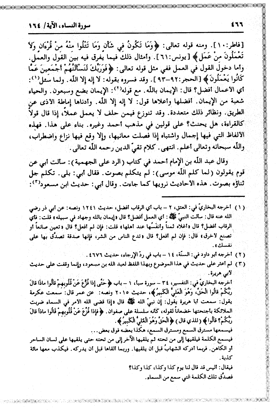 . ونظائر ذلك متعددة. وقد تنوزع فيمن حلف لا يعمل عملا، إذا قال قولا كالقراءة، هل يحنث؟ على قولين في مذهب أحمد وغيره. بناء على هذا. فهذه الألفاظ التي فيها إجمال واشتباه إذا فصلت معانيها، وإلا وقع فيها نزاع واضطراب، والله سبحانه وتعالى أعلم. انتهى. كلام تقيّ الدين رحمه الله تعالى.