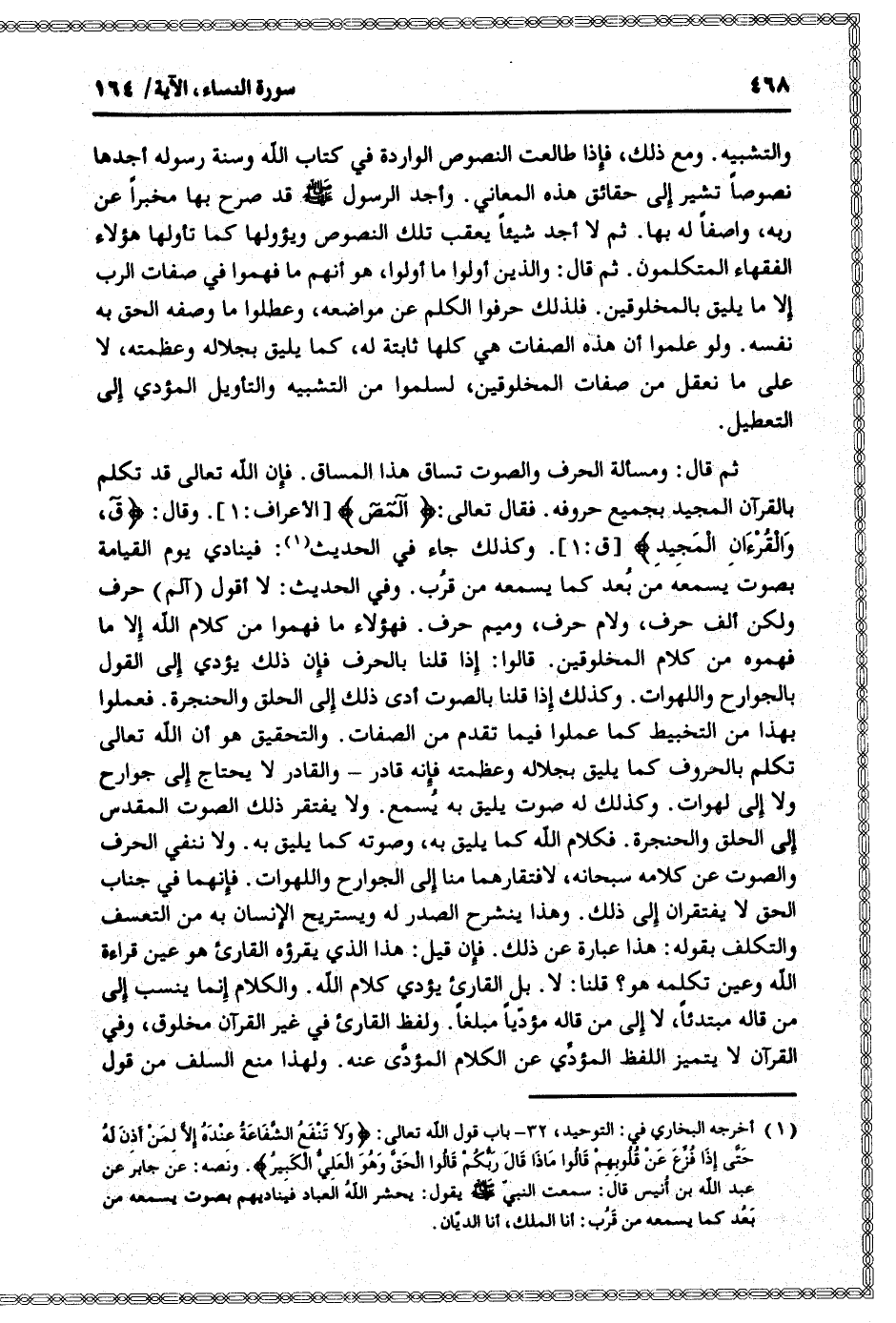 فهؤلاء ما فهموا من كلام الله إلا ما فهموه من كلام المخلوقين. قالوا: إذا قلنا بالحرف فإن ذلك يؤدي إلى القول بالجوارح واللهوات. وكذلك إذا قلنا بالصوت أدى ذلك إلى الحلق والحنجرة. فعملوا بهذا من التخبيط كما عملوا فيما تقدم من الصفات. والتحقيق هو أن الله تعالى تكلم بالحروف كما يليق بجلاله وعظمته فإنه قادر- والقادر لا يحتاج إلى جوارح ولا إلى لهوات. وكذلك له صوت يليق به يسمع. ولا يفتقر ذلك الصوت المقدس إلى الحلق والحنجرة. فكلام الله كما يليق به، وصوته كما يليق به. ولا ننفي الحرف والصوت عن كلامه سبحانه، لافتقارهما منا إلى الجوارح واللهوات. فإنهما في جناب الحق لا يفتقران إلى ذلك. وهذا ينشرح الصدر له ويستريح الإنسان به من التعسف والتكلف بقوله: هذا عبارة عن ذلك. فإن قيل: هذا الذي يقرؤه القارئ هو عين قراءة الله وعين تكلمه هو؟ قلنا: لا. بل القارئ يؤدي كلام الله. والكلام إنما ينسب إلى من قاله مبتدئا، لا إلى من قاله مؤدّيا مبلغا. ولفظ القارئ في غير القرآن مخلوق، وفي القرآن لا يتميز اللفظ المؤدّي عن الكلام المؤدّى عنه. ولهذا منع السلف من قول