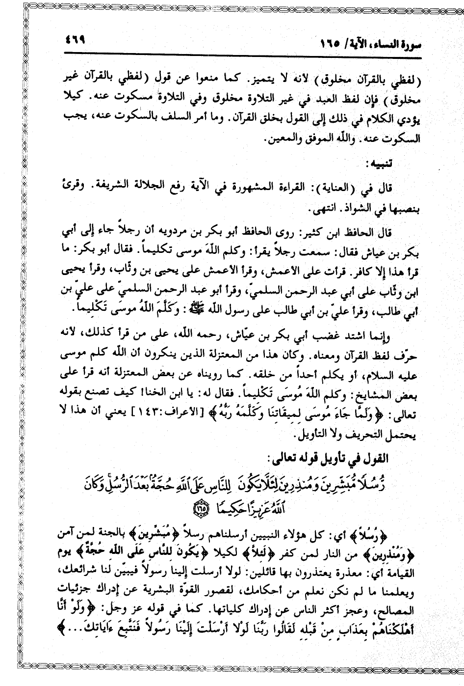 رُسُلاً مُبَشِّرِينَ وَمُنْذِرِينَ لِئَلاَّ يَكُونَ لِلنَّاسِ عَلَى اللَّهِ حُجَّةٌ بَعْدَ الرُّسُلِ وَكانَ اللَّهُ عَزِيزاً حَكِيماً (165)