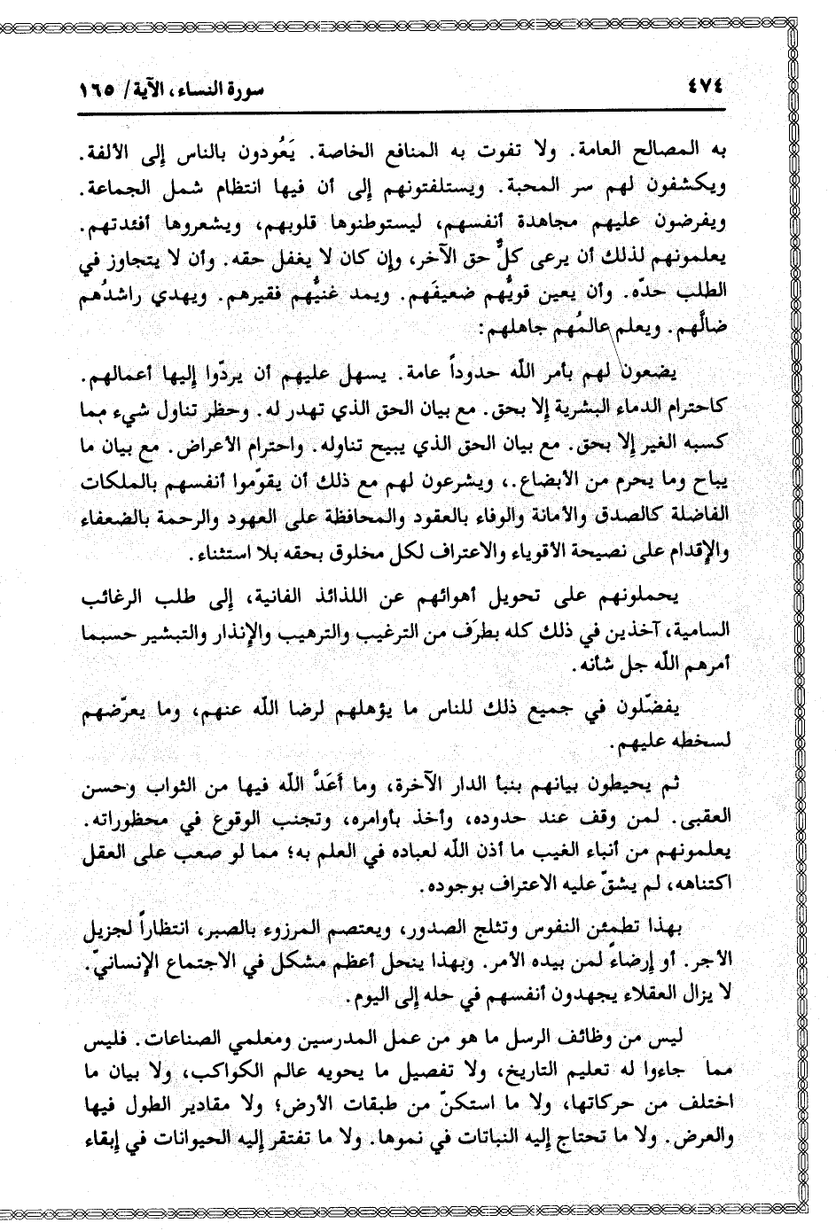 ليس من وظائف الرسل ما هو من عمل المدرسين ومعلمي الصناعات. فليس مما جاءوا له تعليم التاريخ، ولا تفصيل ما يحويه عالم الكواكب، ولا بيان ما اختلف من حركاتها، ولا ما استكنّ من طبقات الأرض ولا مقادير الطول فيها والعرض. ولا ما تحتاج إليه النباتات في نموها. ولا ما تفتقر إليه الحيوانات في إبقاء