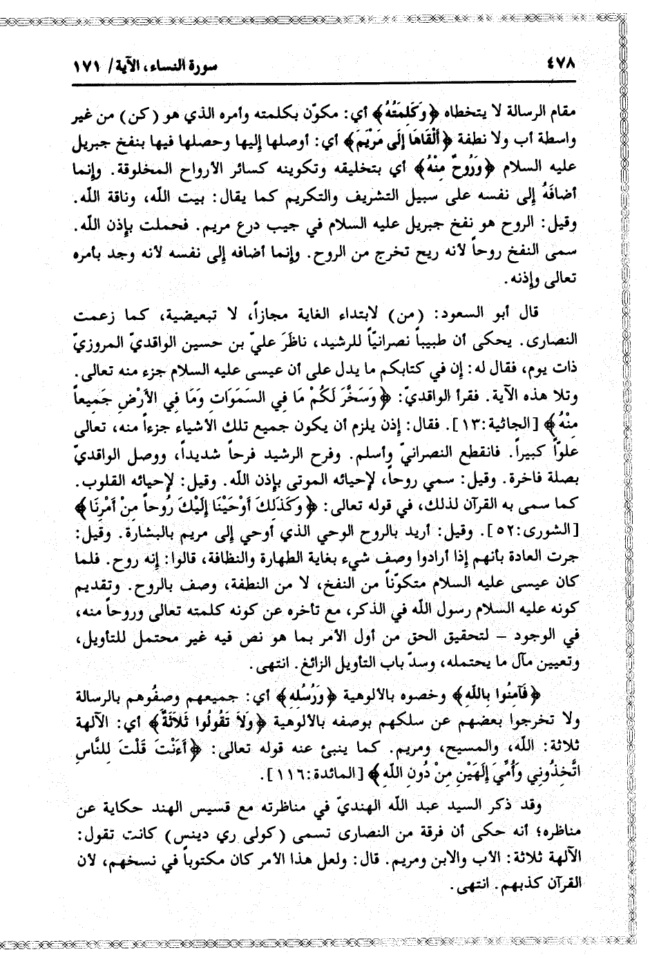 وتلا هذه الآية. فقرأ الواقديّ: وَسَخَّرَ لَكُمْ ما فِي السَّماواتِ وَما فِي الْأَرْضِ جَمِيعاً مِنْهُ [الجاثية: 13] . فقال: إذن يلزم أن يكون جميع تلك الأشياء جزءا منه، تعالى علوّا كبيرا. فانقطع النصرانيّ وأسلم. وفرح الرشيد فرحا شديدا، ووصل الواقديّ بصلة فاخرة. وقيل: سمي روحا، لإحيائه الموتى بإذن الله. وقيل: لإحيائه القلوب.