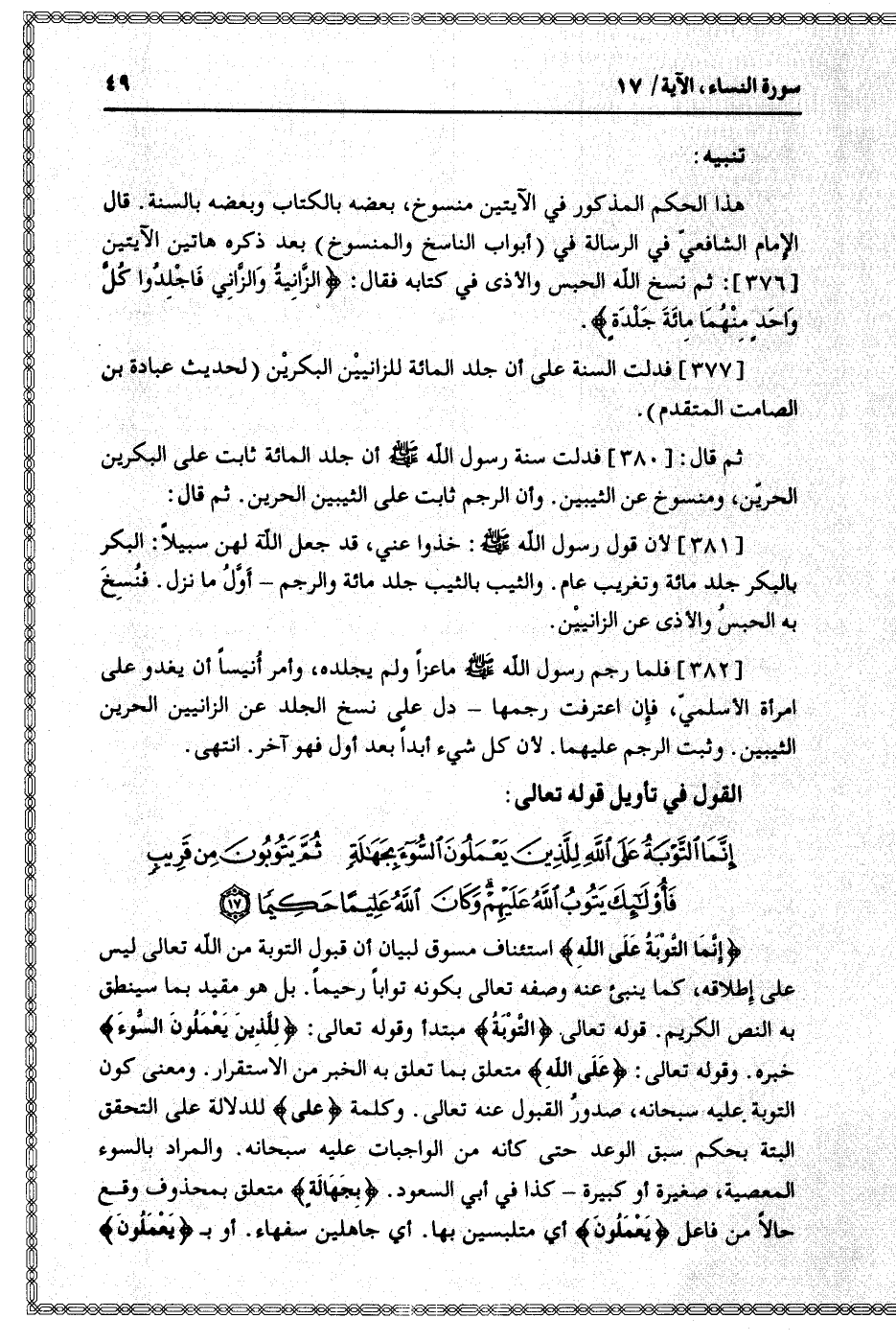 إِنَّمَا التَّوْبَةُ عَلَى اللَّهِ لِلَّذِينَ يَعْمَلُونَ السُّوءَ بِجَهالَةٍ ثُمَّ يَتُوبُونَ مِنْ قَرِيبٍ فَأُولئِكَ يَتُوبُ اللَّهُ عَلَيْهِمْ وَكانَ اللَّهُ عَلِيماً حَكِيماً (17)