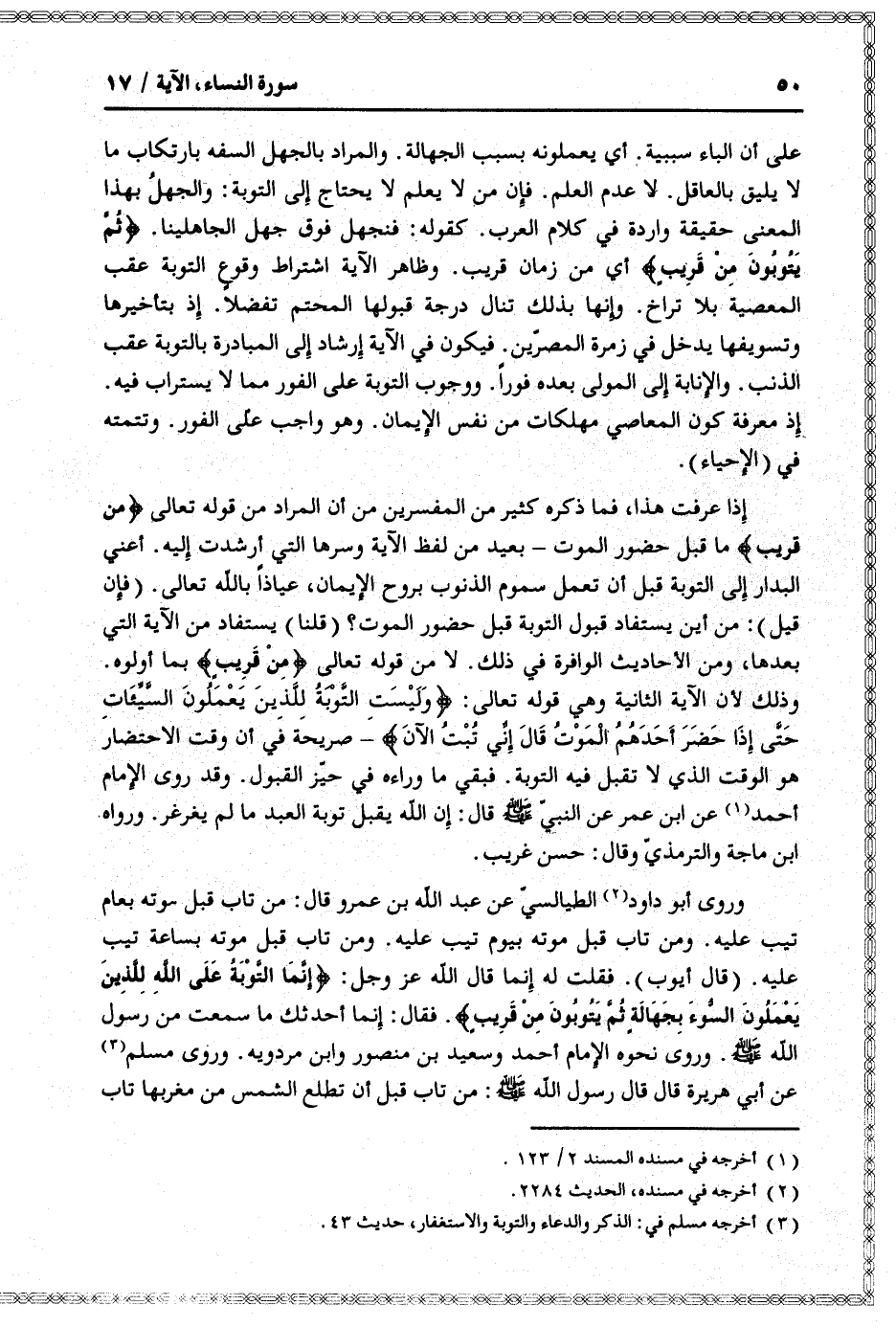 وروى أبو داود «2» الطيالسيّ عن عبد الله بن عمرو قال: من تاب قبل موته بعام تيب عليه. ومن تاب قبل موته بيوم تيب عليه. ومن تاب قبل موته بساعة تيب عليه. (قال أيوب) . فقلت له إنما قال الله عز وجل: إِنَّمَا التَّوْبَةُ عَلَى اللَّهِ لِلَّذِينَ يَعْمَلُونَ السُّوءَ بِجَهالَةٍ ثُمَّ يَتُوبُونَ مِنْ قَرِيبٍ. فقال: إنما أحدثك ما سمعت من رسول الله صلى الله عليه وسلم. وروى نحوه الإمام أحمد وسعيد بن منصور وابن مردويه.