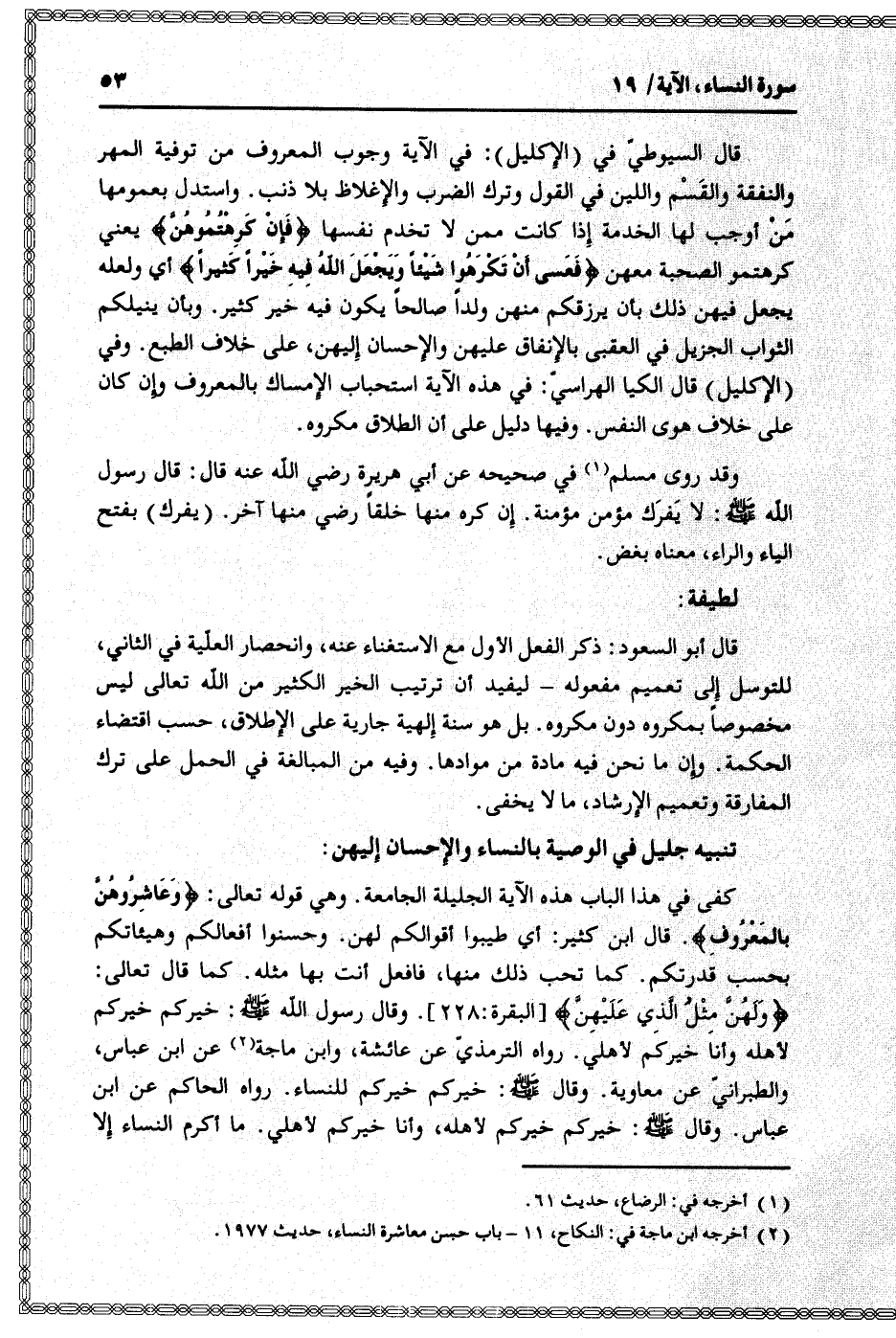 قال السيوطيّ في (الإكليل) : في الآية وجوب المعروف من توفية المهر والنفقة والقسم واللين في القول وترك الضرب والإغلاظ بلا ذنب. واستدل بعمومها من أوجب لها الخدمة إذا كانت ممن لا تخدم نفسها فَإِنْ كَرِهْتُمُوهُنَّ يعني كرهتم الصحبة معهن فَعَسى أَنْ تَكْرَهُوا شَيْئاً وَيَجْعَلَ اللَّهُ فِيهِ خَيْراً كَثِيراً أي ولعله يجعل فيهن ذلك بأن يرزقكم منهن ولدا صالحا يكون فيه خير كثير. وبأن ينيلكم الثواب الجزيل في العقبى بالإنفاق عليهن والإحسان إليهن، على خلاف الطبع. وفي (الإكليل) قال الكيا الهراسيّ: في هذه الآية استحباب الإمساك بالمعروف وإن كان على خلاف هوى النفس. وفيها دليل على أن الطلاق مكروه.