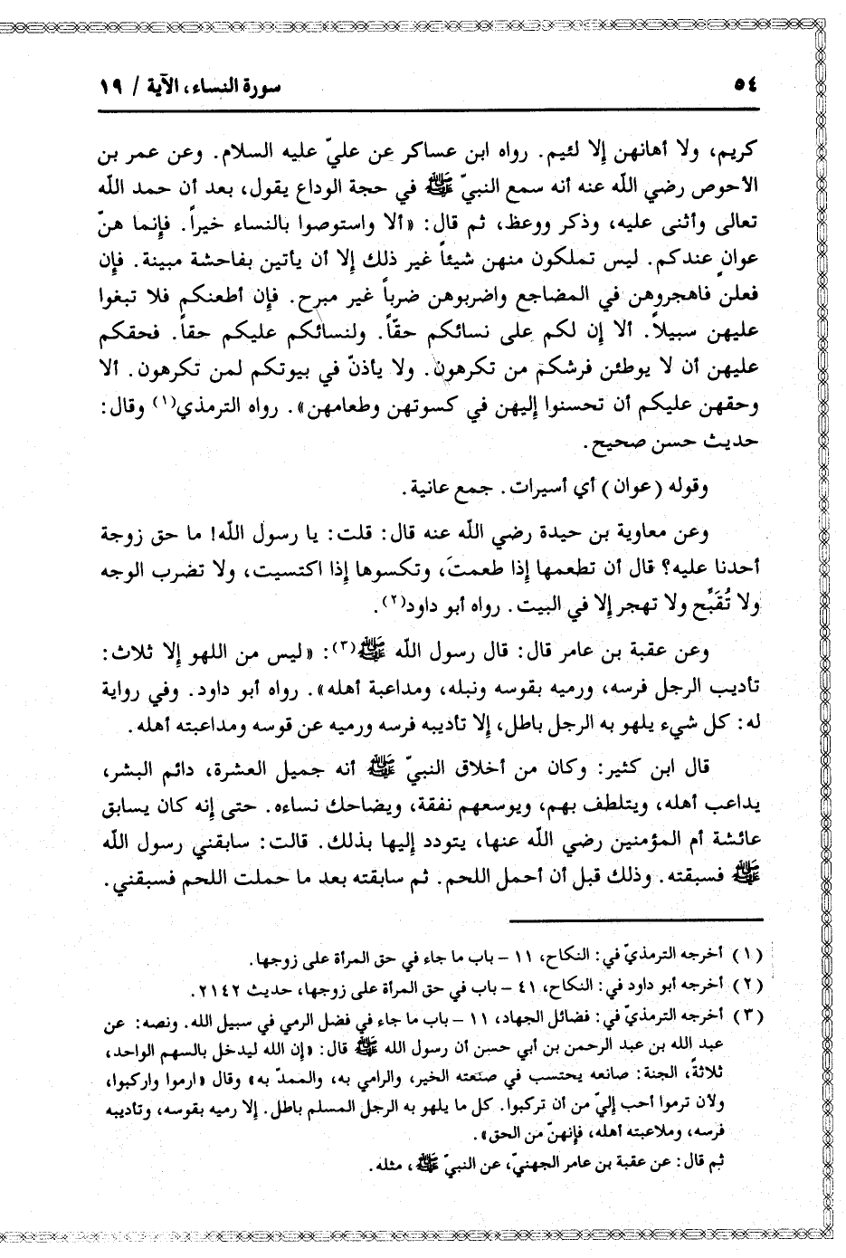وعن عمر بن الأحوص رضي الله عنه أنه سمع النبيّ صلى الله عليه وسلم في حجة الوداع يقول، بعد أن حمد الله تعالى وأثنى عليه، وذكر ووعظ، ثم قال: «ألا واستوصوا بالنساء خيرا. فإنما هنّ عوان عندكم. ليس تملكون منهن شيئا غير ذلك إلا أن يأتين بفاحشة مبينة. فإن فعلن فاهجروهن في المضاجع واضربوهن ضربا غير مبرح. فإن أطعنكم فلا تبغوا عليهن سبيلا. ألا إن لكم على نسائكم حقّا. ولنسائكم عليكم حقا. فحقكم عليهن أن لا يوطئن فرشكم من تكرهون. ولا يأذنّ في بيوتكم لمن تكرهون. ألا وحقهن عليكم أن تحسنوا إليهن في كسوتهن وطعامهن» . رواه الترمذي «1»