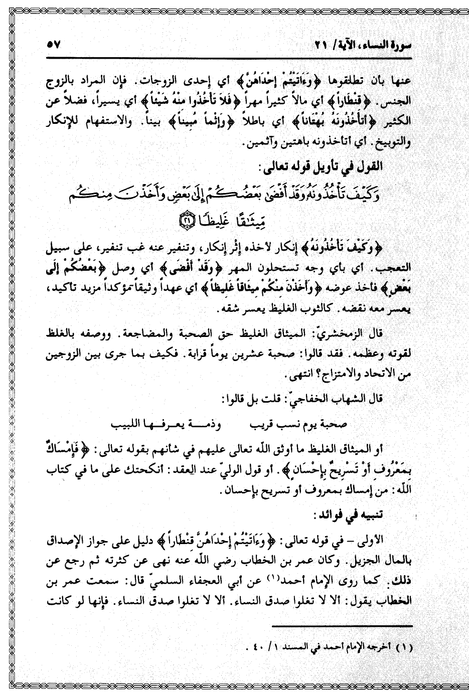 وَكَيْفَ تَأْخُذُونَهُ وَقَدْ أَفْضى بَعْضُكُمْ إِلى بَعْضٍ وَأَخَذْنَ مِنْكُمْ مِيثاقاً غَلِيظاً (21)