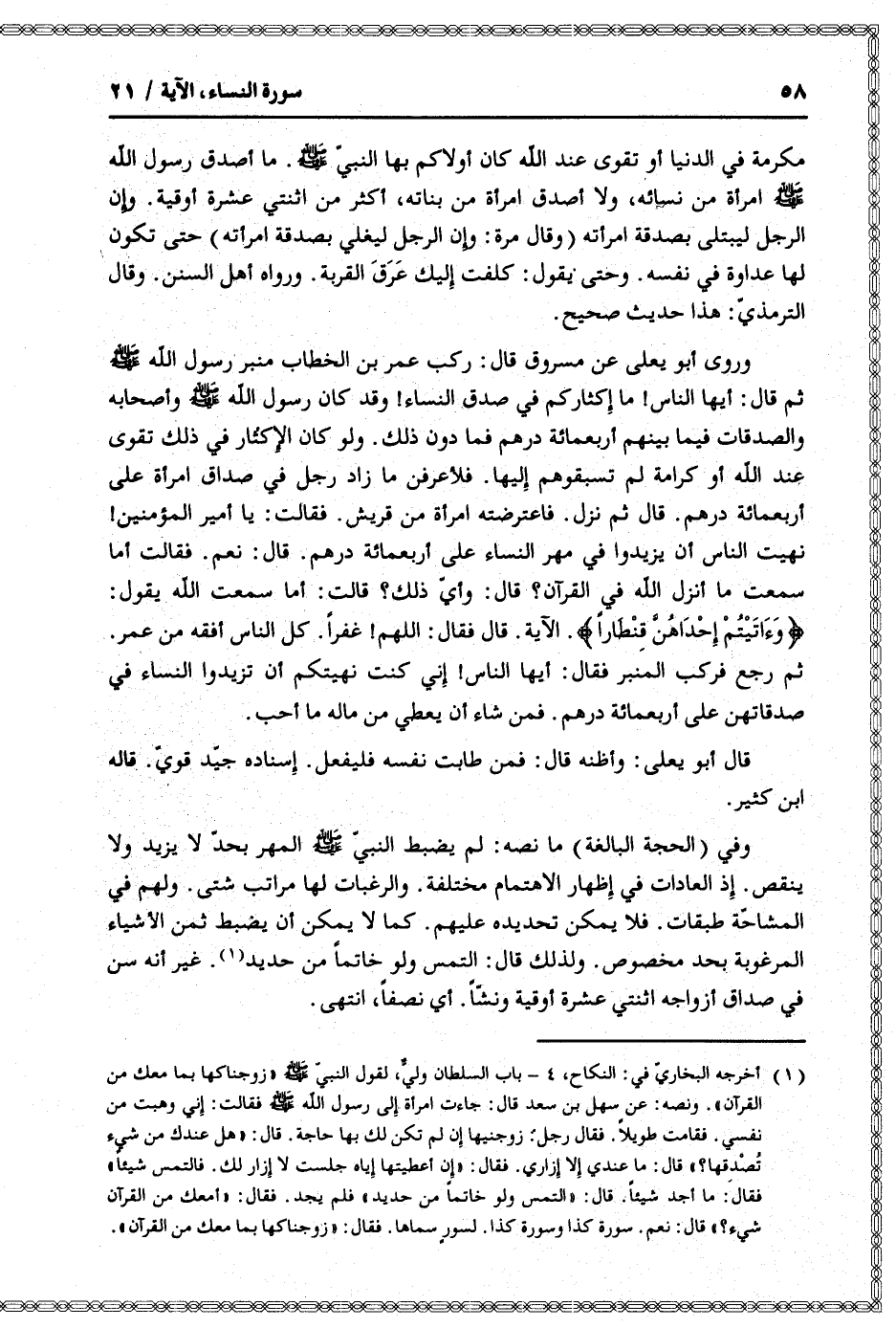 وروى أبو يعلى عن مسروق قال: ركب عمر بن الخطاب منبر رسول الله صلى الله عليه وسلم ثم قال: أيها الناس! ما إكثاركم في صدق النساء! وقد كان رسول الله صلى الله عليه وسلم وأصحابه والصدقات فيما بينهم أربعمائة درهم فما دون ذلك. ولو كان الإكثار في ذلك تقوى عند الله أو كرامة لم تسبقوهم إليها. فلأعرفن ما زاد رجل في صداق امرأة على أربعمائة درهم. قال ثم نزل. فاعترضته امرأة من قريش. فقالت: يا أمير المؤمنين! نهيت الناس أن يزيدوا في مهر النساء على أربعمائة درهم. قال: نعم. فقالت أما سمعت ما أنزل الله في القرآن؟ قال: وأيّ ذلك؟ قالت: أما سمعت الله يقول: