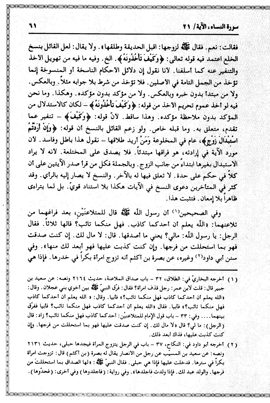 ولا من مبتدأ بدون خبره وبالعكس. ولا من مؤكد بدون مؤكدة. وهكذا. وما نحن فيه لو أخذ عموم تحريم الأخذ من قوله: وَكَيْفَ تَأْخُذُونَهُ- لكان كالاستدلال من المؤكد بدون ملاحظة مؤكدة. وهذا ساقط. لأنّ قوله: وَكَيْفَ- تنفير عما تقدم، متعلق به. وما قبله خاص. ولو زعم القائل بالنسخ أن قوله: وَإِنْ أَرَدْتُمُ اسْتِبْدالَ زَوْجٍ، عام في المخلوعة ومن أريد طلاقها- نقول هذا باطل وفاسد. لأن مورد الآية في إرادته، هو فراقها مبتدئا. فلا يصدق على المختلعة. لأنه لا يراد الاستبدال بغيرها ابتداء من جانب الزوج. وبالجملة فكل من قرأ صدر الآيتين على أن كلا في حكم على حدة. لا تعلق فيها له بالآخر. والنسخ لا يصار إليه بالرأي. وقد كثر في المتأخرين دعوى النسخ في الآيات هكذا بلا استناد قويّ. بل لما يتراءى ظاهرا بلا إمعان. فتثبت هذا.