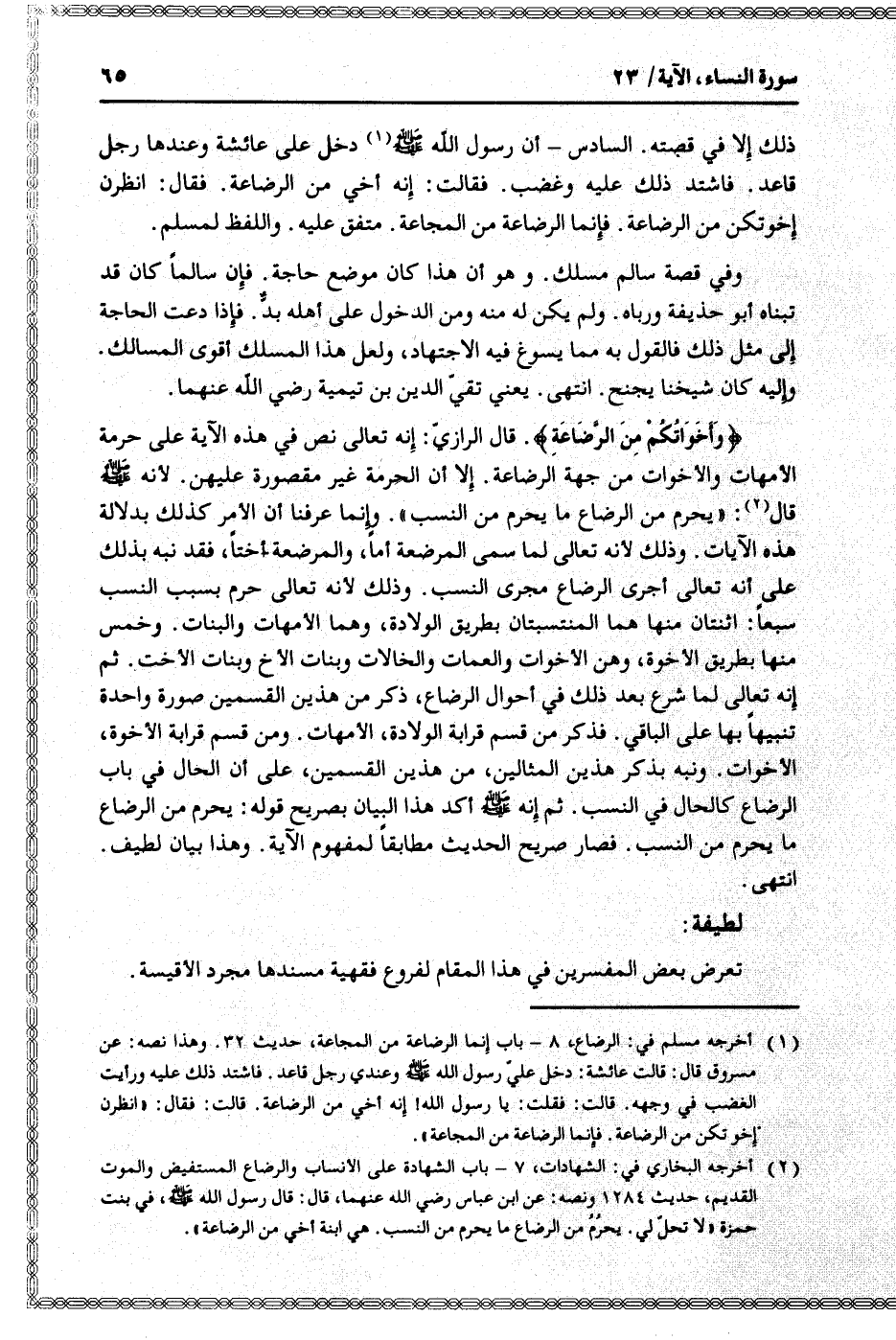 . وإنما عرفنا أن الأمر كذلك بدلالة هذه الآيات. وذلك لأنه تعالى لما سمى المرضعة أما، والمرضعة أختا، فقد نبه بذلك على أنه تعالى أجرى الرضاع مجرى النسب. وذلك لأنه تعالى حرم بسبب النسب سبعا: اثنتان منها هما المنتسبتان بطريق الولادة، وهما الأمهات والبنات. وخمس منها بطريق الأخوة، وهن الأخوات والعمات والخالات وبنات الأخ وبنات الأخت. ثم إنه تعالى لما شرع بعد ذلك في أحوال الرضاع، ذكر من هذين القسمين صورة واحدة تنبيها بها على الباقي. فذكر من قسم قرابة الولادة، الأمهات. ومن قسم قرابة الأخوة، الأخوات. ونبه بذكر هذين المثالين، من هذين القسمين، على أن الحال في باب الرضاع كالحال في النسب. ثم إنه صلى الله عليه وسلم أكد هذا البيان بصريح
