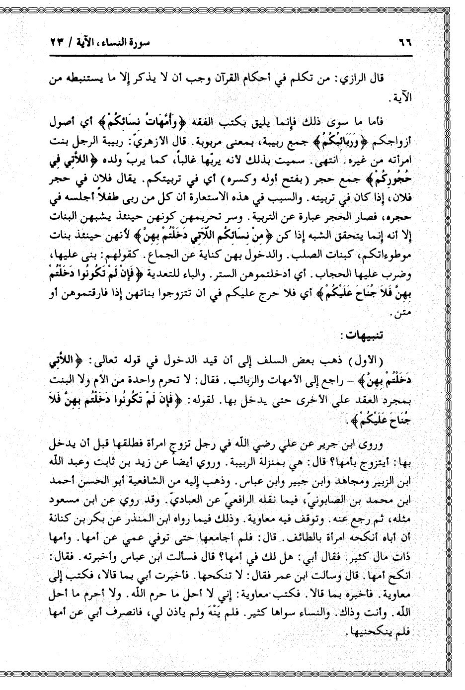 (الأول) ذهب بعض السلف إلى أن قيد الدخول في قوله تعالى: اللَّاتِي دَخَلْتُمْ بِهِنَّ- راجع إلى الأمهات والربائب. فقال: لا تحرم واحدة من الأم ولا البنت بمجرد العقد على الأخرى حتى يدخل بها. لقوله: فَإِنْ لَمْ تَكُونُوا دَخَلْتُمْ بِهِنَّ فَلا جُناحَ عَلَيْكُمْ.