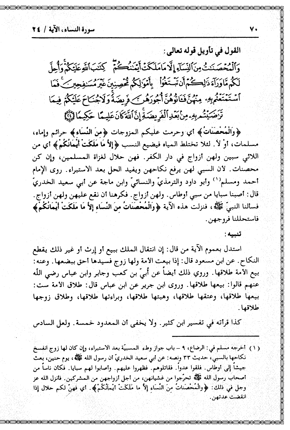 وَالْمُحْصَناتُ مِنَ النِّساءِ إِلاَّ ما مَلَكَتْ أَيْمانُكُمْ كِتابَ اللَّهِ عَلَيْكُمْ وَأُحِلَّ لَكُمْ ما وَراءَ ذلِكُمْ أَنْ تَبْتَغُوا بِأَمْوالِكُمْ مُحْصِنِينَ غَيْرَ مُسافِحِينَ فَمَا اسْتَمْتَعْتُمْ بِهِ مِنْهُنَّ فَآتُوهُنَّ أُجُورَهُنَّ فَرِيضَةً وَلا جُناحَ عَلَيْكُمْ فِيما تَراضَيْتُمْ بِهِ مِنْ بَعْدِ الْفَرِيضَةِ إِنَّ اللَّهَ كانَ عَلِيماً حَكِيماً (24)