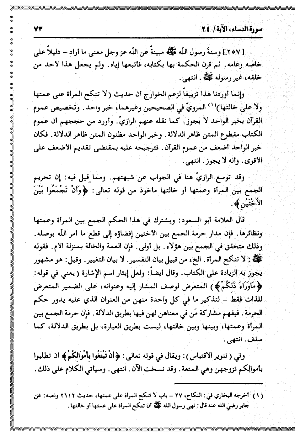 وقد توسع الرازيّ هنا في الجواب عن شبهتهم. ومما قيل فيه: إن تحريم الجمع بين المرأة وعمتها أو خالتها مأخوذ من قوله تعالى: وَأَنْ تَجْمَعُوا بَيْنَ الْأُخْتَيْنِ.