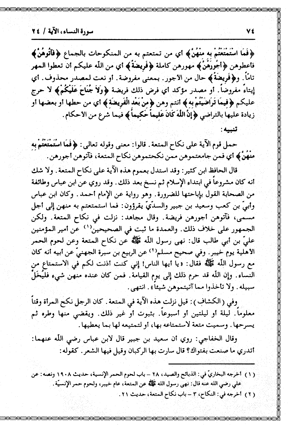 قال الحافظ ابن كثير: وقد استدل بعموم هذه الآية على نكاح المتعة. ولا شك أنه كان مشروعا في ابتداء الإسلام ثم نسخ بعد ذلك. وقد روي عن ابن عباس وطائفة من الصحابة القول بإباحتها للضرورة. وهو رواية عن الإمام أحمد. وكان ابن عباس وأبيّ بن كعب وسعيد بن جبير والسدّيّ يقرءون: فما استمتعتم به منهن إلى أجل مسمى، فآتوهن أجورهن فريضة. وقال مجاهد: نزلت في نكاح المتعة. ولكن الجمهور على خلاف ذلك. والعمدة ما