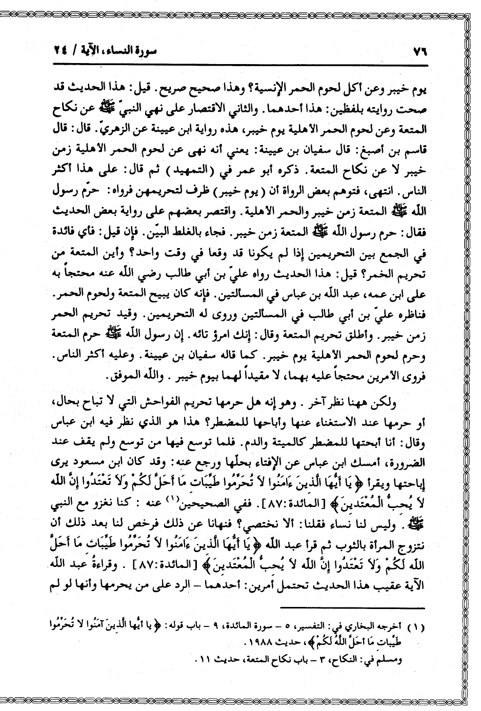 (1) أخرجه البخاري في: التفسير، 5- سورة المائدة، 9- باب قوله: يا أَيُّهَا الَّذِينَ آمَنُوا لا تُحَرِّمُوا طَيِّباتِ ما أَحَلَّ اللَّهُ لَكُمْ، حديث 1988.