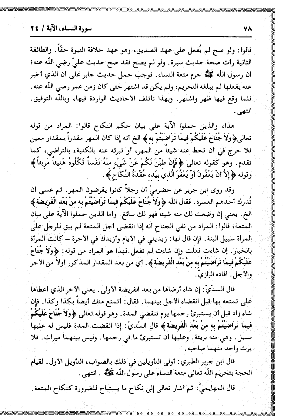 قال السدّيّ: إن شاء أرضاها من بعد الفريضة الأولى. يعني الأحر الذي أعطاها على تمتعه بها قبل انقضاء الأجل بينهما. فقال: أتمتع منك أيضا بكذا وكذا. فإن شاء زاد قبل أن يستبرئ رحمها يوم تنقضي المدة. وهو قوله تعالى وَلا جُناحَ عَلَيْكُمْ فِيما تَراضَيْتُمْ بِهِ مِنْ بَعْدِ الْفَرِيضَةِ قال السّديّ: إذا انقضت المدة فليس له عليها سبيل. وهي منه بريئة. وعليها أن تستبرئ ما في رحمها. وليس بينهما ميراث. فلا يرث واحد منهما صاحبه.
