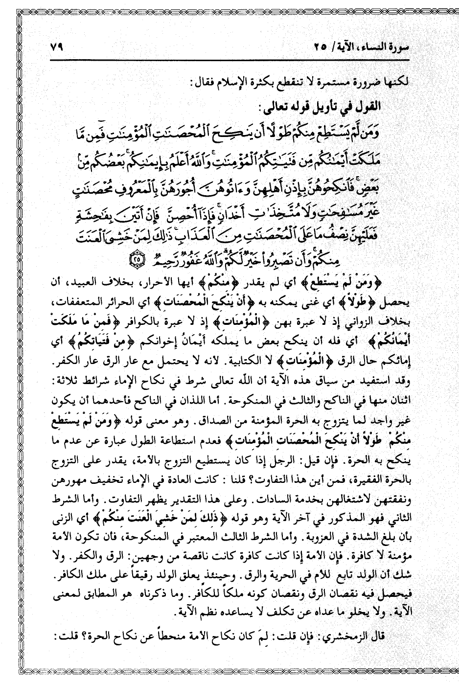 وَمَنْ لَمْ يَسْتَطِعْ مِنْكُمْ طَوْلاً أَنْ يَنْكِحَ الْمُحْصَناتِ الْمُؤْمِناتِ فَمِنْ ما مَلَكَتْ أَيْمانُكُمْ مِنْ فَتَياتِكُمُ الْمُؤْمِناتِ وَاللَّهُ أَعْلَمُ بِإِيمانِكُمْ بَعْضُكُمْ مِنْ بَعْضٍ فَانْكِحُوهُنَّ بِإِذْنِ أَهْلِهِنَّ وَآتُوهُنَّ أُجُورَهُنَّ بِالْمَعْرُوفِ مُحْصَناتٍ غَيْرَ مُسافِحاتٍ وَلا مُتَّخِذاتِ أَخْدانٍ فَإِذا أُحْصِنَّ فَإِنْ أَتَيْنَ بِفاحِشَةٍ فَعَلَيْهِنَّ نِصْفُ ما عَلَى الْمُحْصَناتِ مِنَ الْعَذابِ ذلِكَ لِمَنْ خَشِيَ الْعَنَتَ مِنْكُمْ وَأَنْ تَصْبِرُوا خَيْرٌ لَكُمْ وَاللَّهُ غَفُورٌ رَحِيمٌ (25)