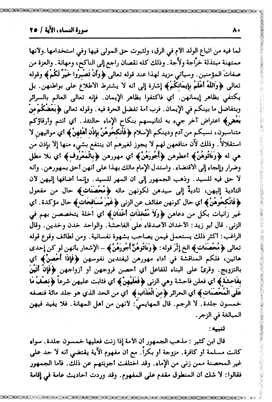 لما فيه من اتباع الولد الأم في الرق، ولثبوت حق المولى فيها وفي استخدامها. ولأنها ممتهنة مبتذلة خرّاجة ولّاجة. وذلك كله نقصان راجع إلى الناكح، ومهانة. والعزة من صفات المؤمنين. وسيأتي مزيد لهذا عند قوله تعالى وَأَنْ تَصْبِرُوا خَيْرٌ لَكُمْ وقوله تعالى وَاللَّهُ أَعْلَمُ بِإِيمانِكُمْ إشارة إلى أنه لا يشترط الاطلاع على بواطنهن. بل يكتفي بظاهر إيمانهن. أي فاكتفوا بظاهر الإيمان. فإنه تعالى العالم بالسرائر وبتفاضل ما بينكم في الإيمان. فرب أمة تفضل الحرة فيه. وقوله تعالى بَعْضُكُمْ مِنْ بَعْضٍ اعتراض آخر جيء به لتأنيسهم بنكاح الإماء حالتئذ. أي أنتم وأرقاؤكم متناسبون، نسبكم من آدم ودينكم الإسلام فَانْكِحُوهُنَّ بِإِذْنِ أَهْلِهِنَّ أي مواليهن لا استقلالا. وذلك لآن منافعهن لهم لا يجوز لغيرهم أن ينتفع بشيء منها إلا بإذن من هي له وَآتُوهُنَّ أعطوهن أُجُورَهُنَّ أي مهورهن بِالْمَعْرُوفِ أي بلا مطل وضرار وإلجاء إلى الاقتضاء. واستدل الإمام مالك بهذا على أنهن أحق بمهورهن. وأنه لا حق فيه للسيد. وذهب الجمهور إلى أن المهر للسيد. وإنما أضافها إليهن لأن التأدية إليهن، تأدية إلى سيدهن لكونهن ماله مُحْصَناتٍ حال من مفعول فَانْكِحُوهُنَّ أي حال كونهن عفائف عن الزنى غَيْرَ مُسافِحاتٍ حال مؤكدة. أي غير زانيات بكل من دعاهن وَلا مُتَّخِذاتِ أَخْدانٍ أي أخلة يتخصصن بهم في الزنى. قال أبو زيد: الأخدان الأصدقاء على الفاحشة. والواحد خدن وخدين. وقال الراغب: أكثر ذلك يستعمل فيمن يصاحب بشهوة نفسانية. ومن لطائف وقوع قوله تعالى مُحْصَناتٍ إلخ إثر قوله: وَآتُوهُنَّ أُجُورَهُنَّ- الإشعار بأنهن لو كن إحدى هاتين، فلكم المناقشة في أداء مهورهن ليفتدين نفوسهن فَإِذا أُحْصِنَّ أي بالتزويج. وقرئ على البناء للفاعل أي أحصن فروجهن أو أزواجهن فَإِنْ أَتَيْنَ بِفاحِشَةٍ أي فعلن فاحشة وهي الزنى فَعَلَيْهِنَّ أي فثابت عليهن شرعا نِصْفُ ما عَلَى الْمُحْصَناتِ أي الحرائر مِنَ الْعَذابِ أي من الحد الذي هو جلد مائة فنصفه خمسون جلدة. لا الرجم. قال المهايميّ: لأنهن من أهل المهانة. فلا يفيد فيهن المبالغة في الزجر.