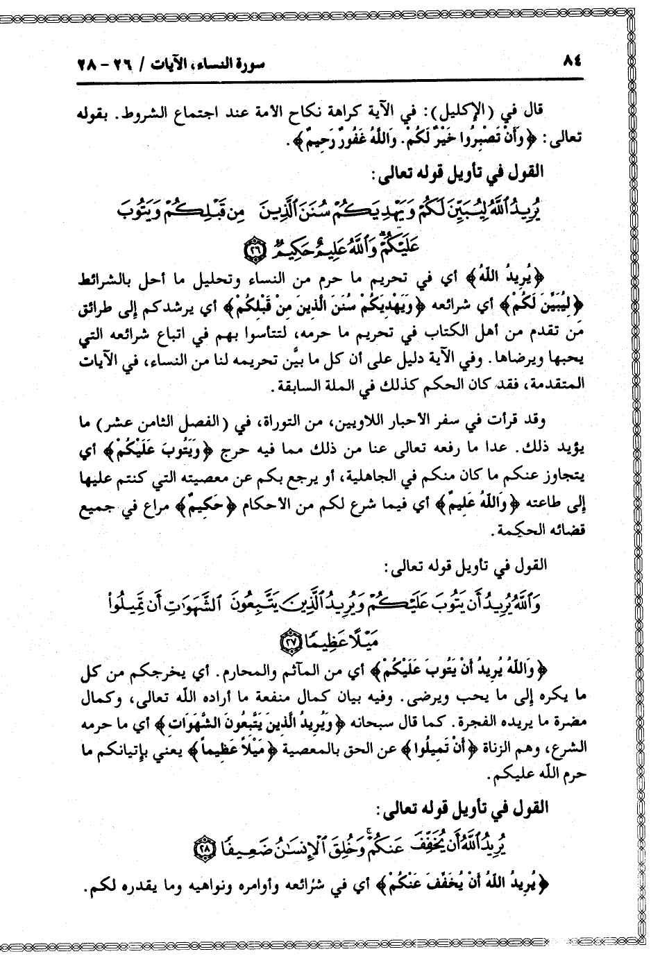 يُرِيدُ اللَّهُ لِيُبَيِّنَ لَكُمْ وَيَهْدِيَكُمْ سُنَنَ الَّذِينَ مِنْ قَبْلِكُمْ وَيَتُوبَ عَلَيْكُمْ وَاللَّهُ عَلِيمٌ حَكِيمٌ (26)