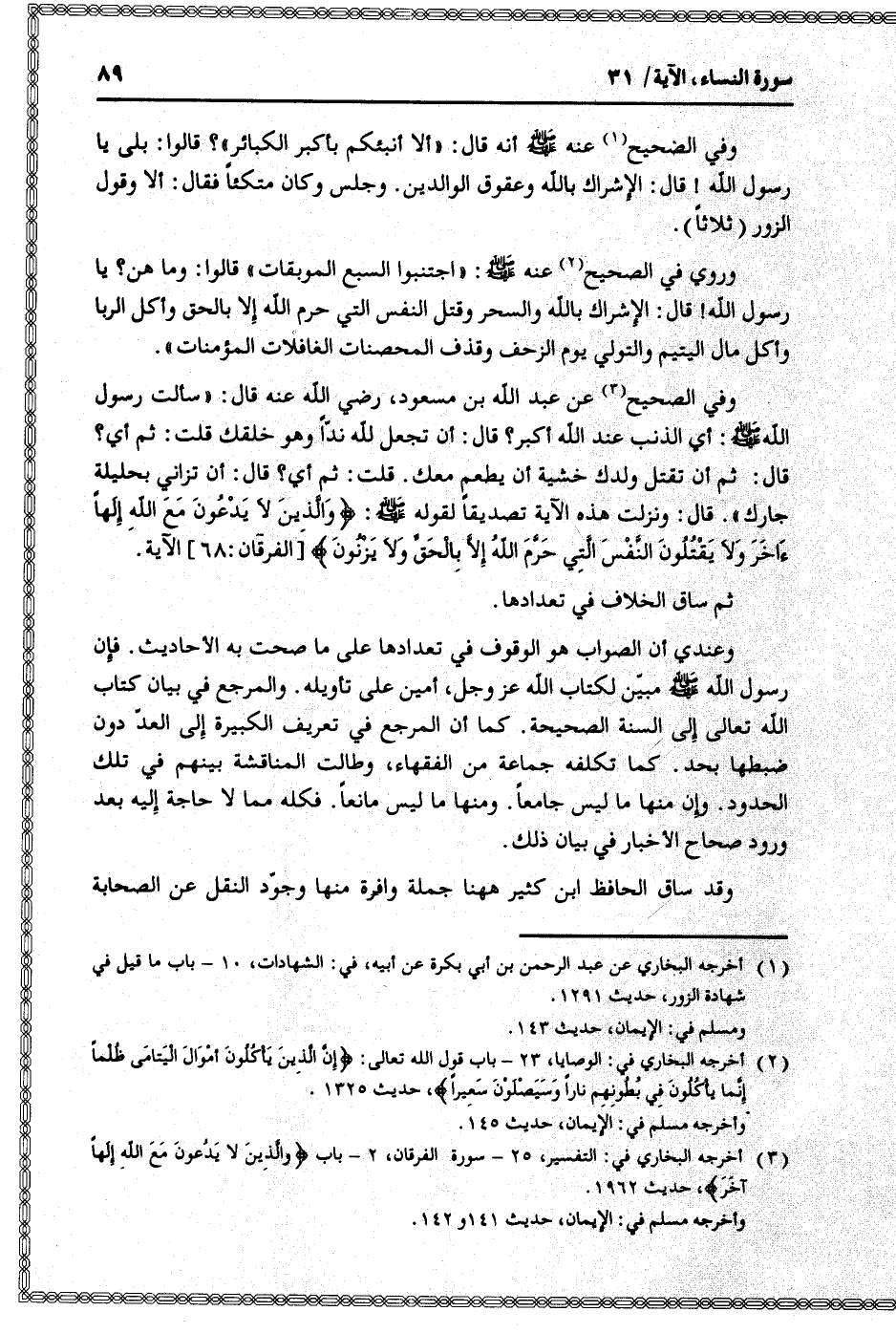 (3) أخرجه البخاري في: التفسير، 25- سورة الفرقان، 2- باب وَالَّذِينَ لا يَدْعُونَ مَعَ اللَّهِ إِلهاً آخَرَ، حديث 1962.