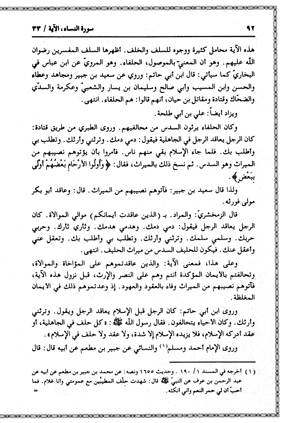 كان الرجل يعاقد الرجل في الجاهلية فيقول: دمي دمك. وترثني وأرثك. وتطلب بي وأطلب بك. فلما جاء الإسلام بقي منهم ناس. فأمروا بأن يؤتوهم نصيبهم من الميراث وهو السدس. ثم نسخ ذلك بالميراث، فقال: وَأُولُوا الْأَرْحامِ بَعْضُهُمْ أَوْلى بِبَعْضٍ.