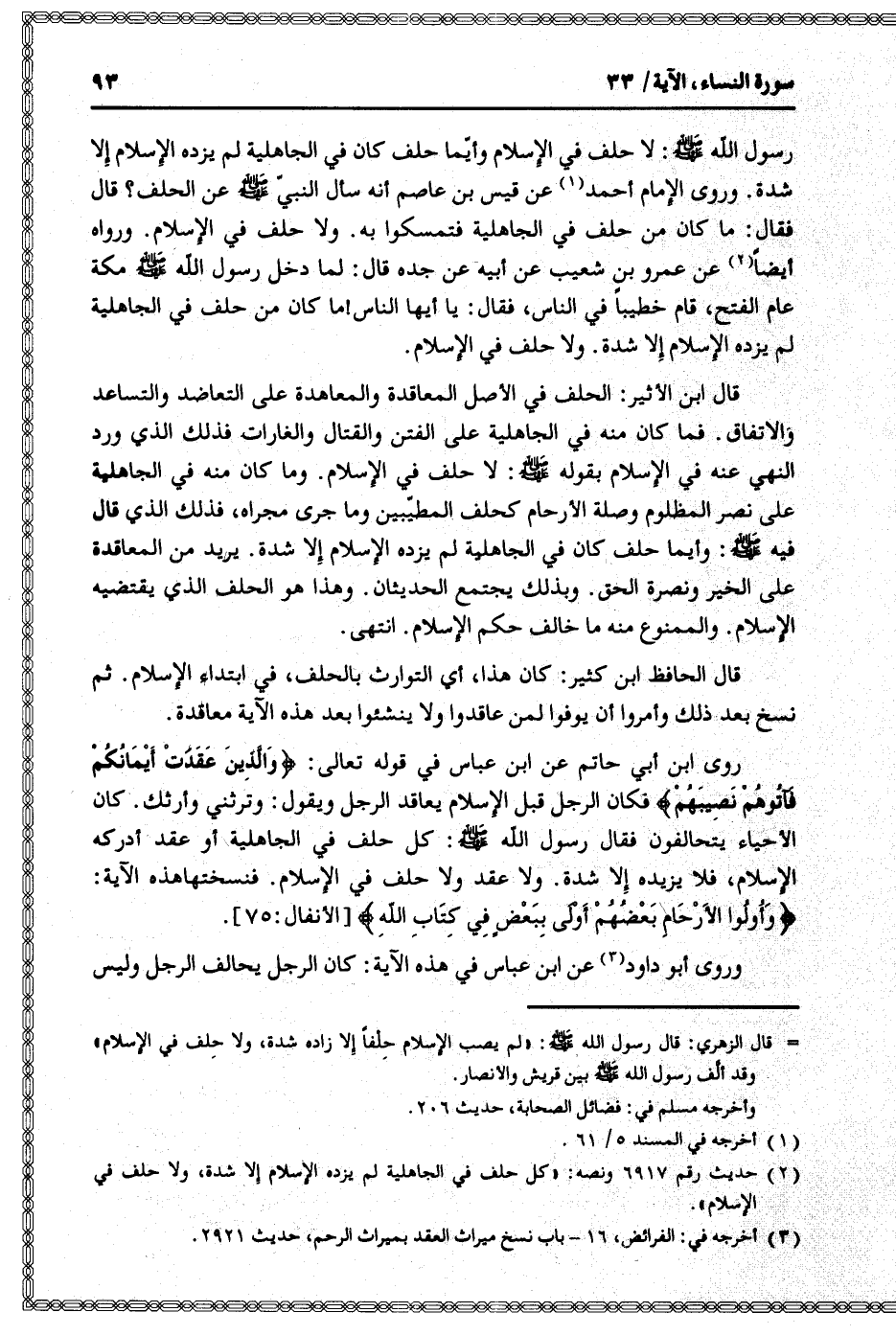 روى ابن أبي حاتم عن ابن عباس في قوله تعالى: وَالَّذِينَ عَقَدَتْ أَيْمانُكُمْ فَآتُوهُمْ نَصِيبَهُمْ فكان الرجل قبل الإسلام يعاقد الرجل ويقول: وترثني وأرثك. كان الأحياء يتحالفون