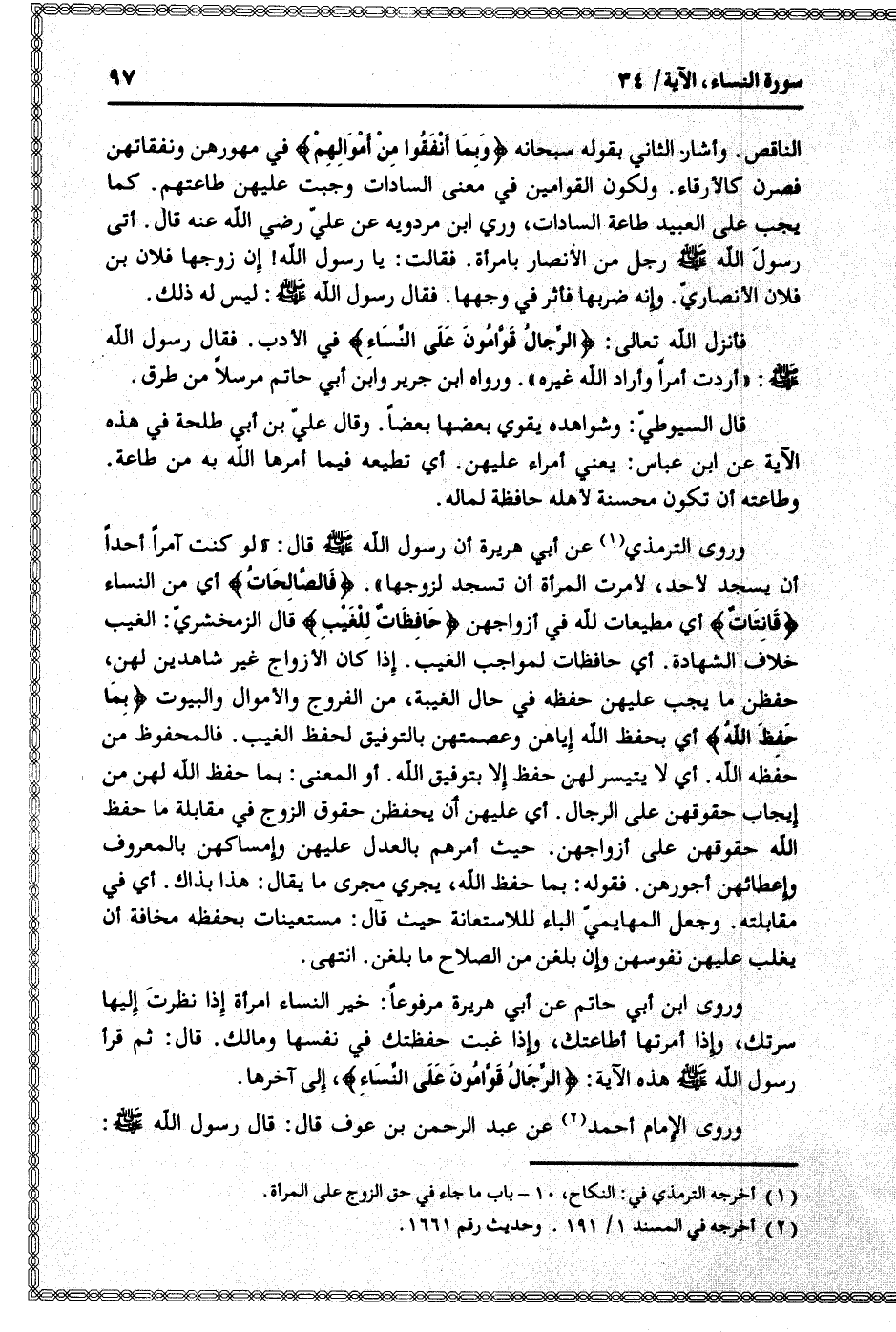 وروى ابن أبي حاتم عن أبي هريرة مرفوعا: خير النساء امرأة إذا نظرت إليها سرتك، وإذا أمرتها أطاعتك، وإذا غبت حفظتك في نفسها ومالك. قال: ثم قرأ رسول الله صلى الله عليه وسلم هذه الآية: الرِّجالُ قَوَّامُونَ عَلَى النِّساءِ، إلى آخرها.