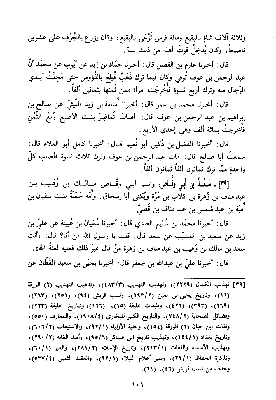 39 تهذيب الكمال (2229) ، وتهذيب التهذيب (3/ 483) ، وتذهيب التهذيب (2) الورقة (11) ، تاريخ يحيى بن معين (2/ 193) ، ونسب قريش (94) ، (251) ، (263) ، (269) ، (393) ، (421) ، وطبقات خليفة (15) ، (126) ، وتاريخ خليفة (223) ، وفضائل الصحابة (2/ 748) ، والتاريخ الكبير للبخاري (4/ 1908) ، والمعارف (550) ، وثقات ابن حبان (1) الورقة (154) ، وحلية الأولياء (1/ 92) ، والاستيعاب (2/ 606) ، وتاريخ بغداد (1/ 144) ، وتهذيب تاريخ ابن عساكر (6/ 95) ، وأسد الغابة (2/ 290) ، وتهذيب الأسماء واللغات (1/ 213) ، وتاريخ الإسلام (2/ 281) ، والعبر (1/ 60) ، وتذكرة الحفاظ (1/ 22) ، وسير أعلام النبلاء (1/ 92) ، والعقد الثمين (4/ 537) ، وحذف من نسب قريش (46) ، (61) .