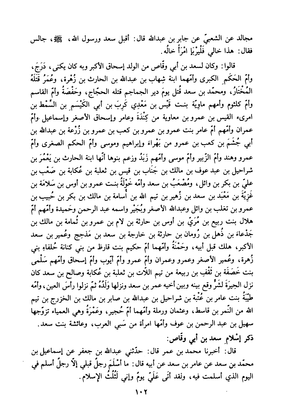 وَأُمُّ الْحَكَمِ الْكُبْرَى وَأُمُّهُمَا ابْنَةُ شِهَابِ بْنِ عَبْدِ اللَّهِ بْنِ الْحَارِثِ بْنِ زُهْرَةَ. وَعُمَرُ قَتَلَهُ الْمُخْتَارُ. وَمُحَمَّدُ بْنُ سَعْدٍ قُتِلَ يَوْمَ دَيْرِ الْجَمَاجِمِ قَتَلَهُ الْحَجَّاجُ. وَحَفْصَةُ وَأُمُّ الْقَاسِمِ وَأُمُّ كُلْثُومٍ وَأُمُّهُمْ مَاوِيَّةُ بِنْتُ قَيْسِ بْنِ مَعْدِي كَرِبَ بْنِ أَبِي الْكَيْسَمِ بْنِ السِّمْطِ بْنِ امْرِئِ الْقَيْسِ بْنِ عَمْرِو بْنِ مُعَاوِيَةَ مِنْ كِنْدَةَ وَعَامِرٌ وَإِسْحَاقُ الأَصْغَرُ وَإِسْمَاعِيلُ وَأُمُّ عِمْرَانَ وَأُمُّهُمْ أُمُّ عَامِرِ بِنْتُ عَمْرِو بْنِ عَمْرِو بْنِ كَعْبِ بْنِ عَمْرِو بْنِ زُرْعَةَ بْنِ عَبْدِ اللَّهِ بْنِ أَبِي جُشَمَ بْنِ كَعْبِ بْنِ عَمْرٍو مِنْ بَهْرَاءَ وَإِبْرَاهِيمُ وَمُوسَى وَأُمُّ الْحَكَمِ الصُّغْرَى وَأُمُّ عَمْرٍو وَهِنْدُ وَأُمُّ الزُّبَيْرِ وَأُمُّ مُوسَى وَأُمُّهُمْ زبد وزعم بَنُوهَا أَنَّهَا ابْنَةُ الْحَارِثِ بْنِ يَعْمَرَ بْنِ شَرَاحِيلَ بْنِ عَبْدِ عَوْفِ بْنِ مَالِكِ بْنِ جَنَابِ بْنِ قَيْسِ بْنِ ثَعْلَبَةَ بْنِ عَكَابَةَ بْنِ صَعْبِ بْنِ علي بن بكر بن وَائِلٍ. وَمُصْعَبُ بْنُ سَعْدٍ وَأُمُّهُ خَوْلَةُ بِنْتُ عَمْرِو بْنِ أَوْسِ بْنِ سَلامَةَ بْنِ غَزِيَّةَ بْنِ مَعْبَدِ بْنِ سَعْدِ بْنِ زُهَيْرِ بْنِ تَيْمِ اللَّهِ بْنِ أُسَامَةَ بْنِ مَالِكِ بْنِ بَكْرِ بْنِ حَبِيبِ بْنِ عَمْرِو بْنِ تَغْلِبَ بْنِ وَائِلٍ وَعَبْدُ اللَّهِ الأَصْغَرُ وَبُجَيْرٌ وَاسْمُهُ عَبْدُ الرَّحْمَنِ وَحَمِيدَةُ وَأُمُّهُمْ أُمُّ هِلالِ بِنْتُ رَبِيعِ بْنِ مُرَيِّ بْنِ أَوْسِ بْنِ حَارِثَةَ بْنِ لامِ بْنِ عَمْرِو بْنِ ثُمَامَةَ بْنِ مَالِكِ بْنِ جَدْعَاءَ بْنِ ذُهْلِ بْنِ رُومَانَ بْنِ حَارِثَةَ بْنِ خَارِجَةَ بْنِ سَعْدِ بْنِ مَذْحِجِ وَعُمَيْرُ بْنُ سَعْدٍ الأَكْبَرُ. هَلَكَ قَبْلَ أبيه. وحمنة وأمهما أُمُّ حَكِيمٍ بِنْتُ قَارِظٍ مِنْ بَنِي كِنَانَةَ حلفاء بني زهرة. وعمير الأصغر وعمرو وَعِمْرَانُ وَأُمُّ عَمْرٍو وَأُمُّ أَيُّوبَ وَأُمُّ إِسْحَاقَ وَأُمُّهُمْ سَلْمَى بِنْتُ خَصَفَةَ بْنِ ثَقْفِ بْنِ رَبِيعَةَ مِنْ تَيْمِ اللاتِ بْنِ ثَعْلَبَةَ بْنِ عُكَابَةَ وَصَالِحُ بْنُ سَعْدٍ كَانَ نَزَلَ الْحِيرَةَ لِشَرٍّ وَقَعَ بَيْنَهُ وَبَيْنَ أَخِيهِ عُمَرَ بْنِ سَعْدٍ وَنَزَلَهَا وَلَدُهُ ثُمَّ نَزَلُوا رَأْسَ الْعَيْنِ. وَأُمُّهُ طَيْبَةُ بِنْتُ عَامِرِ بْنِ عُتْبَةَ بْنِ شَرَاحِيلَ بْنِ عَبْدِ اللَّهِ بْنِ صَابِرِ بْنِ مَالِكِ بْنِ الْخَزْرَجِ بْنِ تَيْمِ اللَّهِ مِنَ النَّمِرِ بْنِ قَاسِطٍ. وَعُثْمَانُ وَرَمْلَةُ وَأُمُّهُمَا أُمُّ حُجَيْرٍ. وَعَمْرَةُ وَهِيَ الْعَمْيَاءُ تَزَوَّجَهَا سُهَيْلُ بْنُ عَبْدِ الرَّحْمَنِ بْنِ عَوْفٍ وَأُمُّهَا امْرَأَةٌ مِنْ سَبْيِ الْعَرَبِ. وَعَائِشَةُ بِنْتُ سَعْدٍ.