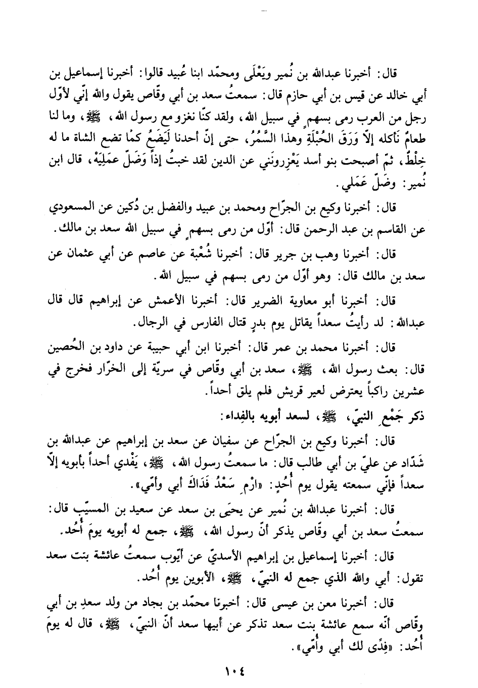 [قَالَ: أَخْبَرَنَا وَكِيعُ بْنُ الْجَرَّاحِ عَنْ سُفْيَانَ عَنْ سَعْدِ بْنِ إِبْرَاهِيمَ عَنْ عَبْدِ اللَّهِ بْنِ شَدَّادٍ عَنْ عَلِيِّ بْنِ أَبِي طَالِبٍ قَالَ: مَا سَمِعْتُ رَسُولَ اللَّهِ - صَلَّى اللَّهُ عَلَيْهِ وَسَلَّمَ - يَفْدِي أَحَدًا بِأَبَوَيْهِ إِلا سَعْدًا فَإِنِّي سَمِعْتُهُ يَقُولُ يَوْمَ أُحُدٍ: ارْمِ سَعْدُ فِدَاكَ أَبِي وَأُمِّي] .