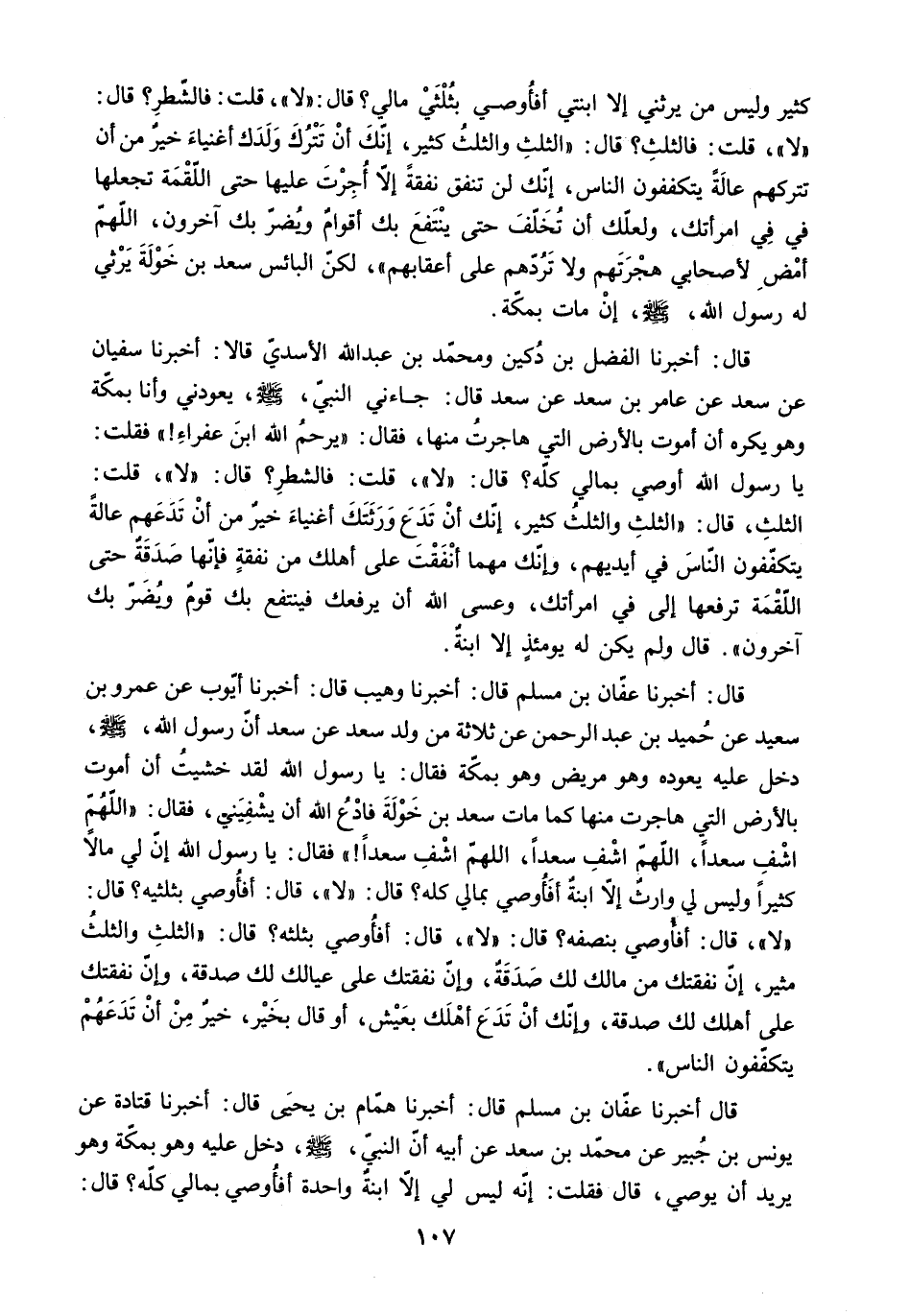 [قَالَ أَخْبَرَنَا عَفَّانُ بْنُ مُسْلِمٍ قَالَ: أَخْبَرَنَا هَمَّامُ بْنُ يَحْيَى قَالَ: أَخْبَرَنَا قَتَادَةُ عَنْ يُونُسَ بْنِ جُبَيْرٍ عَنْ مُحَمَّدِ بْنِ سَعْدٍ عَنْ أَبِيهِ أَنَّ النَّبِيَّ - صَلَّى اللَّهُ عَلَيْهِ وَسَلَّمَ - دَخَلَ عَلَيْهِ وَهُوَ بِمَكَّةَ وَهُوَ يُرِيدُ أَنْ يُوصِيَ. قَالَ فَقُلْتُ: إِنَّهُ لَيْسَ لِي إِلا ابْنَةٌ وَاحِدَةٌ أفأوصي بمالي كله؟ قال: