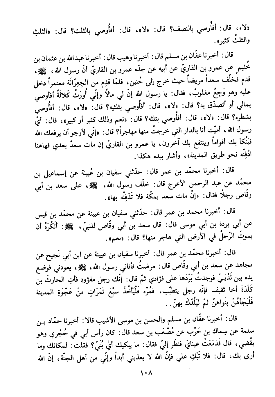 قَدِمَ فَخَلَّفَ سَعْدًا مَرِيضًا حَيْثُ خَرَجَ إِلَى حُنَيْنٍ. فَلَمَّا قَدِمَ مِنَ الْجِعْرَانَةِ مُعْتَمِرًا دَخَلَ عَلَيْهِ وَهُوَ وَجِعٌ مَغْلُوبٌ. [فَقَالَ: يَا رَسُولَ اللَّهِ إِنَّ لِي مَالا وَإِنِّي أُورَثُ كَلالَةً أَفَأُوصِي بِمَالِي أَوْ أَتَصَدَّقُ بِهِ؟ قَالَ: لا. قَالَ: أَفَأُوصِي بِثُلُثَيْهِ؟ قَالَ: لا. قَالَ: أَفَأُوصِي بِشَطْرِهِ؟ قَالَ: لا. قَالَ: أَفَأُوصِي بِثُلُثِهِ؟ قَالَ: نَعَمْ وَذَلِكَ كَثِيرٌ أَوْ كَبِيرٌ. قَالَ: أَيْ رَسُولَ اللَّهِ. أَمَيِّتٌ أَنَا بِالدَّارِ الَّتِي خَرَجْتُ مِنْهَا مُهَاجِرًا؟ قَالَ: إِنِّي لأَرْجُو أَنْ يَرْفَعَكَ اللَّهُ فَيَنْكَأَ بِكَ أَقْوَامًا وَيَنْتَفِعَ بِكَ آخَرُونَ. يَا عَمْرَو بن القاري إن مات سعد بعدي فهاهنا ادْفِنْهُ نَحْوَ طَرِيقِ الْمَدِينَةِ. وَأَشَارَ بِيَدِهِ هَكَذَا] .