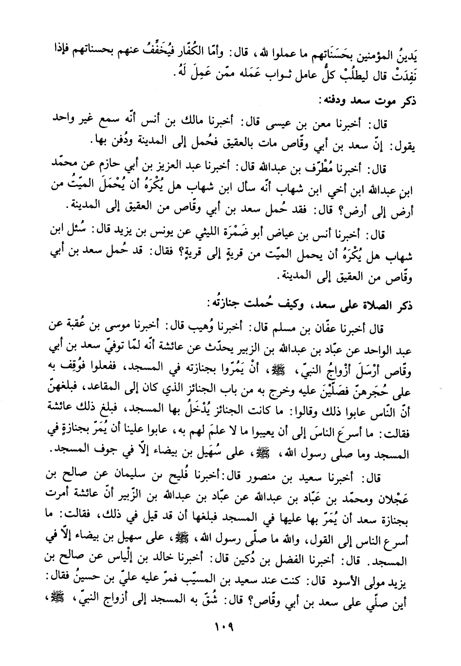 قَالَ: أَخْبَرَنَا سَعِيدُ بْنُ مَنْصُورٍ قَالَ: أَخْبَرَنَا فُلَيْحُ بْنُ سُلَيْمَانَ عَنْ صَالِحِ بْنِ عَجْلانَ وَمُحَمَّدِ بْنِ عَبَّادِ بْنِ عَبْدِ اللَّهِ عَنْ عَبَّادِ بْنِ عَبْدِ اللَّهِ بْنِ الزُّبَيْرِ أَنَّ عَائِشَةَ أَمَرَتْ بِجِنَازَةِ سَعْدٍ أَنْ يُمَرَّ بِهَا عَلَيْهَا فِي الْمَسْجِدِ فَبَلَغَهَا أَنْ قَدْ قِيلَ فِي ذَلِكَ. فَقَالَتْ: مَا أَسْرَعَ النَّاسَ إِلَى الْقَوْلِ. وَاللَّهِ مَا صَلَّى رَسُولُ اللَّهِ - صَلَّى اللَّهُ عَلَيْهِ وَسَلَّمَ - عَلَى سُهَيْلِ بْنِ بَيْضَاءَ إِلا فِي الْمَسْجِدِ. قَالَ: أَخْبَرَنَا الْفَضْلُ بْنُ دُكَيْنٍ قَالَ: أَخْبَرَنَا خَالِدُ بْنُ إِلْيَاسَ عَنْ صَالِحِ بْنِ يَزِيدَ مَوْلَى الأَسْوَدِ قَالَ: كُنْتُ عِنْدَ سَعِيدِ بْنِ الْمُسَيِّبِ فَمَرَّ عَلَيْهِ عَلِيُّ بْنُ حُسَيْنٍ فَقَالَ: