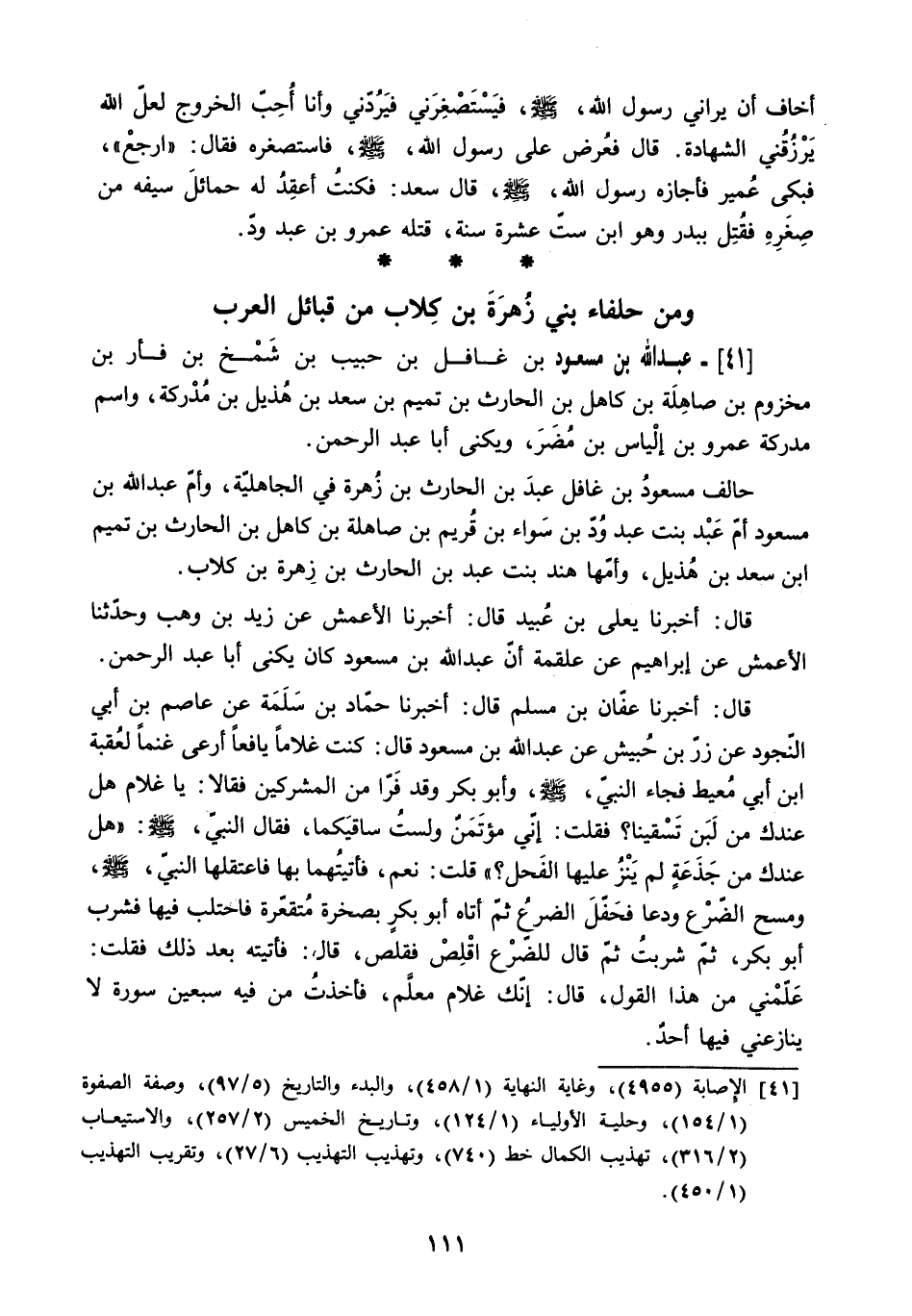 41 الإصابة (9455) ، وغاية النهاية (1/ 458) ، والبدء والتاريخ (5/ 97) ، وصفة الصفوة (1/ 154) ، وحلية الأولياء (1/ 124) ، وتاريخ الخميس (2/ 257) ، والاستيعاب (2/ 316) ، تهذيب الكمال خط (740) ، وتهذيب التهذيب (6/ 27) ، وتقريب التهذيب (1/ 450) .