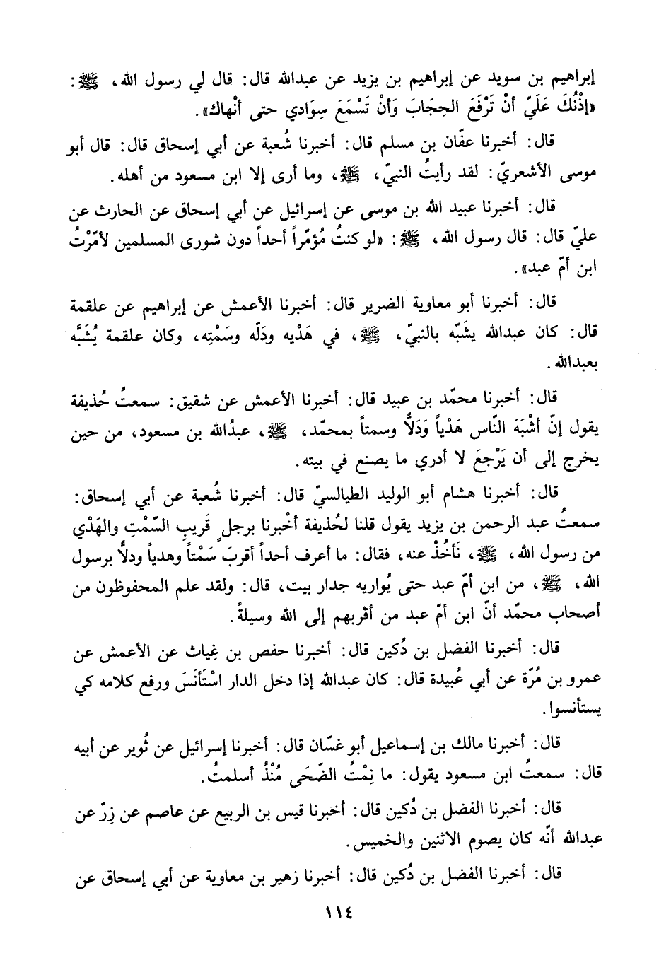 [قَالَ: أَخْبَرَنَا عُبَيْدُ اللَّهِ بْنُ مُوسَى عَنْ إِسْرَائِيلَ عَنْ أَبِي إِسْحَاقَ عَنِ الْحَارِثِ عَنْ عَلِيٍّ قَالَ: قال رسول الله. ص: لَوْ كُنْتُ مُؤَمِّرًا أَحَدًا دُونَ شُورَى الْمُسْلِمِينَ لأَمَّرْتُ ابْنَ أُمِّ عَبْدٍ] .