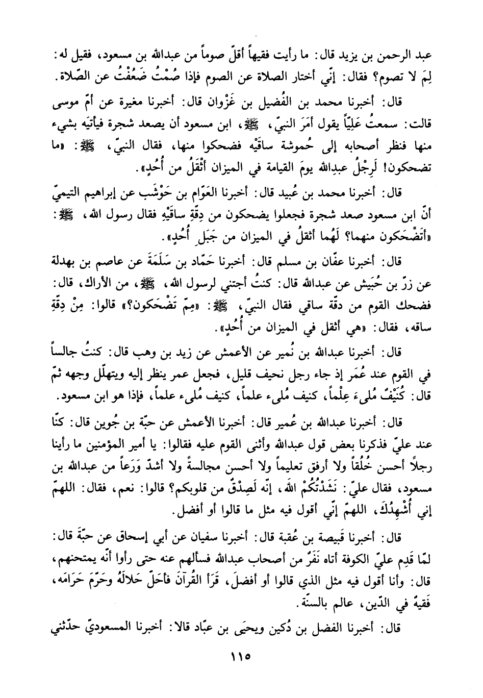 [قَالَ: أَخْبَرَنَا مُحَمَّدُ بْنُ الْفُضَيْلِ بْنِ غَزْوَانَ قَالَ: أَخْبَرَنَا مُغِيرَةُ عَنْ أُمِّ مُوسَى قَالَتْ: سَمِعْتُ عَلِيًّا يَقُولُ أَمَرَ النَّبِيُّ - صَلَّى اللَّهُ عَلَيْهِ وَسَلَّمَ - ابْنَ مَسْعُودٍ أَنْ يَصْعَدَ شَجَرَةً فَيَأْتِيَهُ بِشَيْءٍ مِنْهَا فَنَظَرَ أَصْحَابُهُ إِلَى حُمُوشَةِ سَاقَيْهِ فَضَحِكُوا مِنْهَا. فقال النبي. ص: مَا تَضْحَكُونَ! لَرِجْلُ عَبْدِ اللَّهِ يَوْمَ الْقِيَامَةِ فِي الْمِيزَانِ أَثْقَلُ مِنْ أُحُدٍ] .