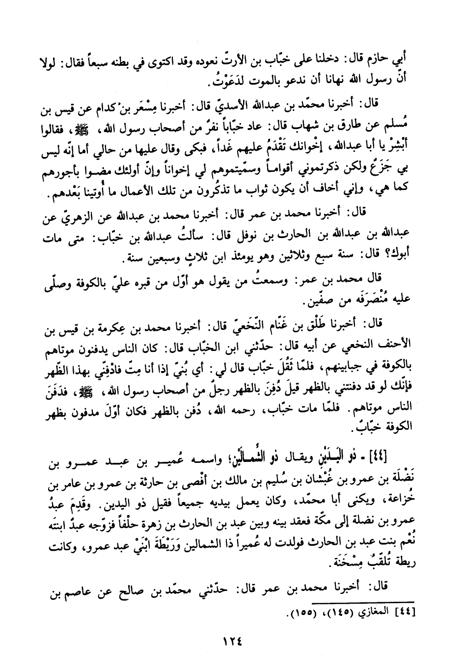 قَالَ: أَخْبَرَنَا مُحَمَّدُ بْنُ عَبْدِ اللَّهِ الأَسَدِيُّ قال: أخبرنا مسعر بْنُ كِدَامٍ عَنْ قَيْسِ بْنِ مُسْلِمٍ عَنْ طَارِقِ بْنِ شِهَابٍ قَالَ: عَادَ خَبَّابًا نَفَرٌ مِنْ أَصْحَابِ رَسُولِ اللَّهِ - صَلَّى اللَّهُ عَلَيْهِ وَسَلَّمَ - فَقَالُوا أَبْشِرْ يَا أَبَا عَبْدِ اللَّهِ. إِخْوَانُكَ تَقْدَمُ عَلَيْهِمْ غَدًا. فَبَكَى وَقَالَ عَلَيْهَا مِنْ حَالِي أَمَا إِنَّهُ لَيْسَ بِي جَزَعٌ وَلَكِنْ ذَكَّرْتُمُونِي أَقْوَامًا وَسَمَّيْتُمُوهُمْ لِي إِخْوَانًا وَإِنَّ أُولَئِكَ مَضَوْا بِأُجُورِهِمْ كَمَا هِيَ. وَإِنِّي أَخَافُ أَنْ يَكُونَ ثَوَابَ مَا تَذْكُرُونَ مِنْ تِلْكَ الأَعْمَالِ مَا أُوتِينَا بَعْدَهُمْ.