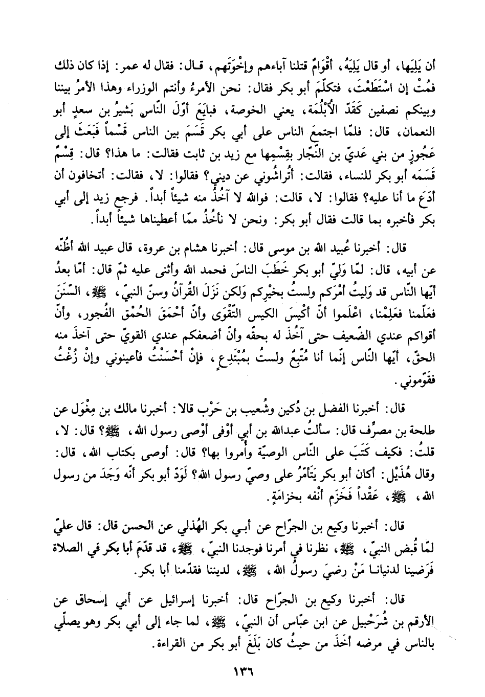 قَالَ: أَخْبَرَنَا وَكِيعُ بْنُ الْجَرَّاحِ عَنْ أَبِي بَكْرٍ الْهُذَلِيِّ عَنِ الْحَسَنِ قَالَ: قَالَ عَلِيٌّ لَمَّا قُبِضَ النَّبِيُّ - صَلَّى اللَّهُ عَلَيْهِ وَسَلَّمَ - نَظَرْنَا فِي أَمْرِنَا فَوَجَدْنَا النَّبِيَّ - صَلَّى اللَّهُ عَلَيْهِ وَسَلَّمَ - قَدْ قَدَّمَ أَبَا بَكْرٍ فِي الصَّلاةِ فَرَضِينَا لِدُنْيَانَا مَنْ رَضِيَ رَسُولُ اللَّهِ - صَلَّى اللَّهُ عَلَيْهِ وَسَلَّمَ - لِدِينِنَا فَقَدَّمْنَا أَبَا بَكْرٍ.