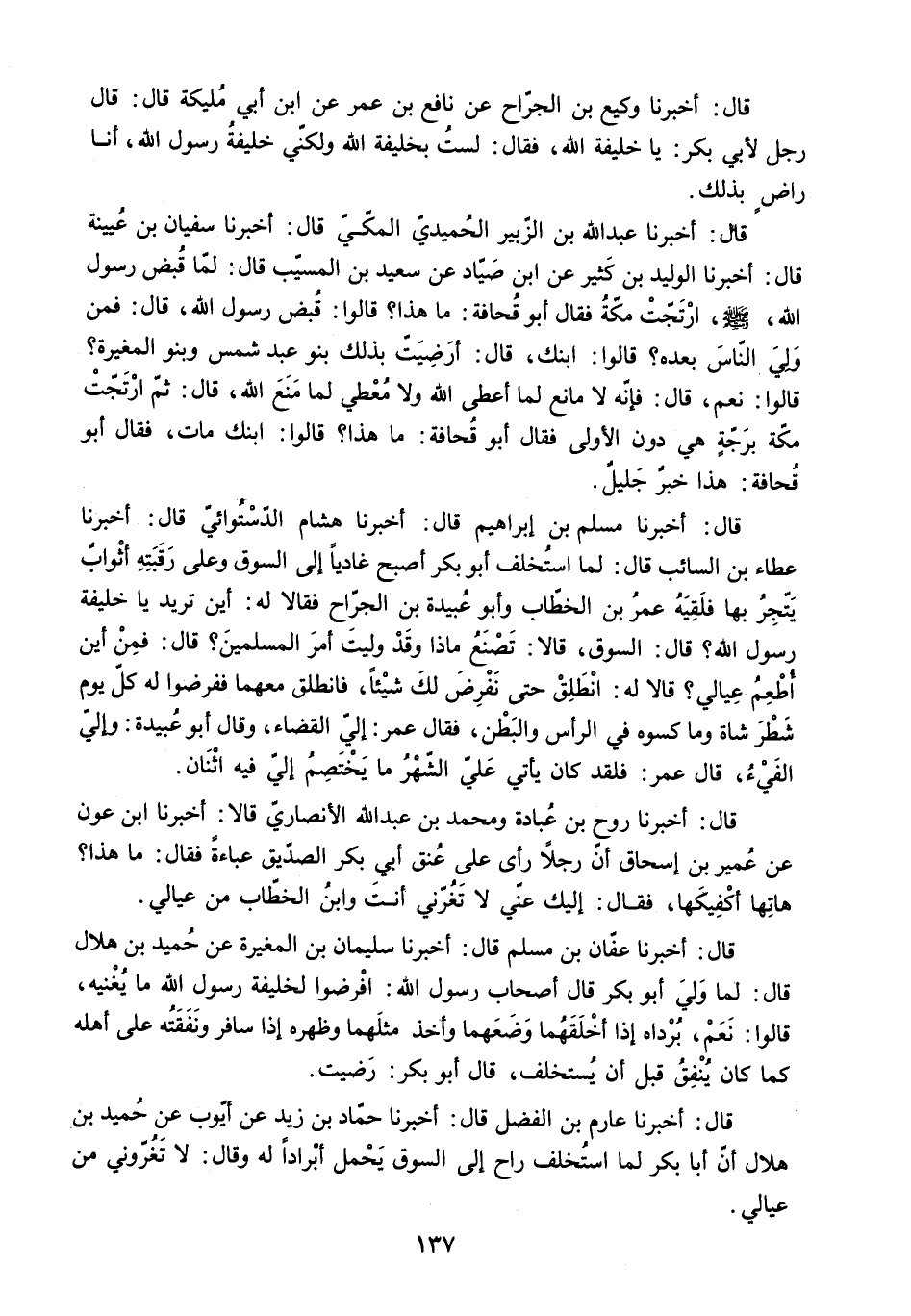 قَالَ: أَخْبَرَنَا مُسْلِمُ بْنُ إِبْرَاهِيمَ قَالَ: أَخْبَرَنَا هِشَامُ الدَّسْتُوَائِيُّ قَالَ: أَخْبَرَنَا عَطَاءُ بْنُ السَّائِبِ قَالَ: لَمَّا اسْتُخْلِفَ أَبُو بَكْرٍ أَصْبَحَ غَادِيًا إِلَى السُّوقِ وَعَلَى رَقَبَتِهِ أَثْوَابٌ يَتَّجِرُ بِهَا فَلَقِيَهُ عُمَرُ بْنُ الْخَطَّابِ وَأَبُو عُبَيْدَةَ بْنُ الْجَرَّاحِ فَقَالا لَهُ: أَيْنَ تُرِيدُ يَا خَلِيفَةَ رَسُولِ اللَّهِ؟ قَالَ: السُّوقَ. قَالا: تَصْنَعُ مَاذَا وَقَدْ وُلِّيتَ أَمْرَ الْمُسْلِمِينَ؟ قَالَ: فَمِنْ أَيْنَ أُطْعِمُ عِيَالِي؟ قَالا لَهُ: انْطَلِقْ حَتَّى نَفْرِضَ لَكَ شَيْئًا. فَانْطَلَقَ مَعَهُمَا فَفَرَضُوا لَهُ كُلَّ يَوْمٍ شَطْرَ شَاةٍ وماكسوه فِي الرَّأْسِ وَالْبَطْنِ. فَقَالَ عُمَرُ: إِلَيَّ الْقَضَاءُ. وَقَالَ أَبُو عُبَيْدَةَ: وَإِلَيَّ الْفَيْءُ. قَالَ عُمَرُ: فَلَقَدْ كَانَ يَأْتِي عَلَيَّ الشَّهْرُ مَا يَخْتَصِمُ إِلَيَّ فِيهِ اثْنَانِ.