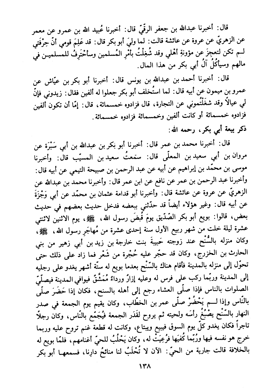 قَالَ: أَخْبَرَنَا عَبْدُ اللَّهِ بْنُ جَعْفَرٍ الرَّقِّيُّ قَالَ: أَخْبَرَنَا عُبَيْدُ اللَّهِ بْنُ عَمْرٍو عَنْ مَعْمَرٍ عَنِ الزُّهْرِيِّ عَنْ عُرْوَةَ عَنْ عَائِشَةَ قَالَتْ: لَمَّا وَلِيَ أَبُو بَكْرٍ قَالَ: قَدْ عَلِمَ قَوْمِي أَنَّ حِرْفَتِيَ لَمْ تَكُنْ لِتَعْجَزَ عن مؤونة أَهْلِي وَقَدْ شُغِلْتُ بِأَمْرِ الْمُسْلِمِينَ وَسَأَحْتَرِفُ لِلْمُسْلِمِينَ فِي مَالِهِمْ وَسَيَأْكُلُ آلُ أَبِي بَكْرٍ مِنْ هَذَا الْمَالِ.