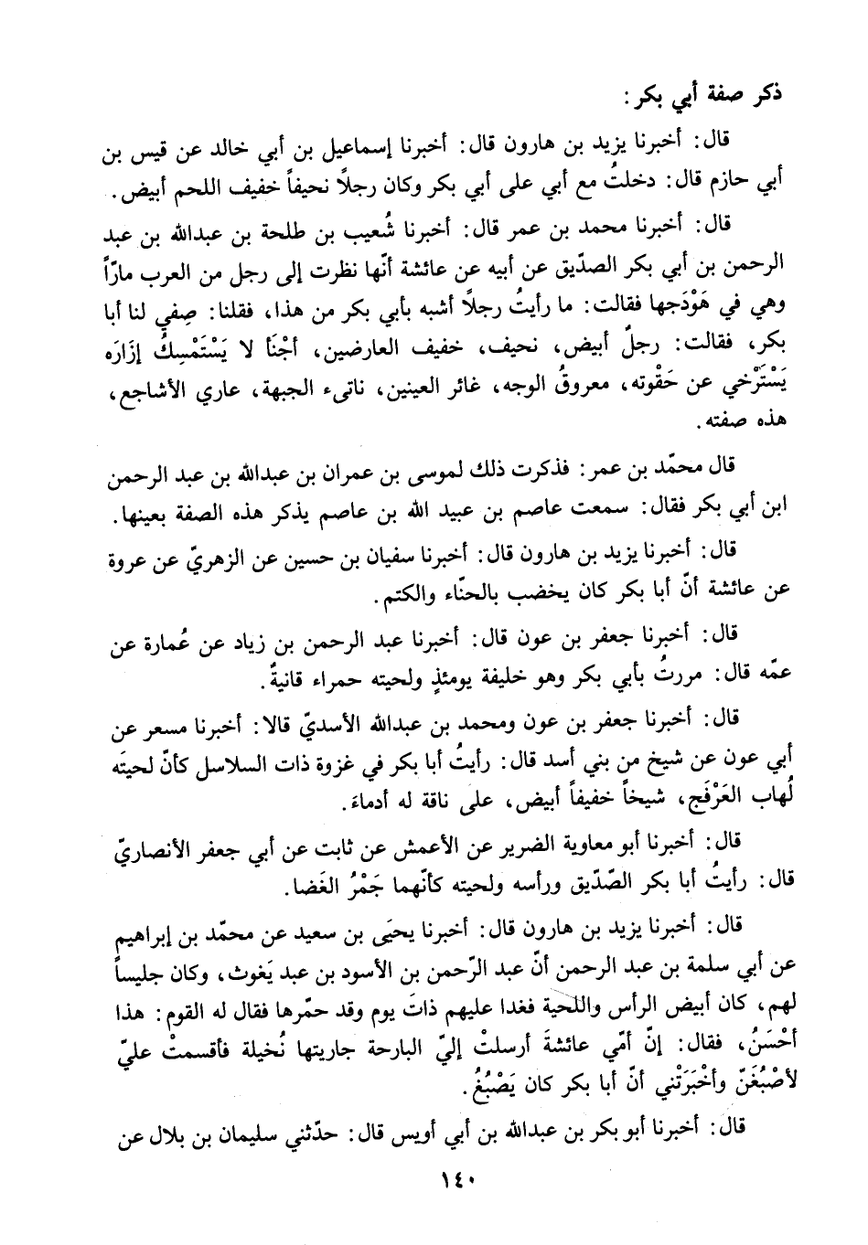 قَالَ: أَخْبَرَنَا مُحَمَّدُ بْنُ عُمَرَ قَالَ: أَخْبَرَنَا شُعَيْبُ بْنُ طَلْحَةَ بْنِ عَبْدِ اللَّهِ بْنِ عَبْدِ الرَّحْمَنِ بْنِ أَبِي بَكْرٍ الصِّدِّيقِ عَنْ أَبِيهِ عَنْ عَائِشَةَ أَنَّهَا نَظَرَتْ إِلَى رَجُلٍ مِنَ الْعَرَبِ مَارًّا وَهِيَ فِي هَوْدَجِهَا فَقَالَتْ: مَا رَأَيْتُ رَجُلا أَشْبَهَ بِأَبِي بَكْرٍ مِنْ هَذَا. فَقُلْنَا: صِفِي لَنَا أَبَا بَكْرٍ. فَقَالَتْ: رَجُلٌ أَبْيَضُ. نَحِيفٌ. خَفِيفُ الْعَارِضَيْنِ. أَجْنَأُ لا يَسْتَمْسِكُ إِزَارَهُ يَسْتَرْخِي عَنْ حَقْوَتِهِ. مَعْرُوقُ الْوَجْهِ. غَائِرُ الْعَيْنَيْنِ. نَاتِئُ الْجَبْهَةِ. عَارِي الأَشَاجِعِ.