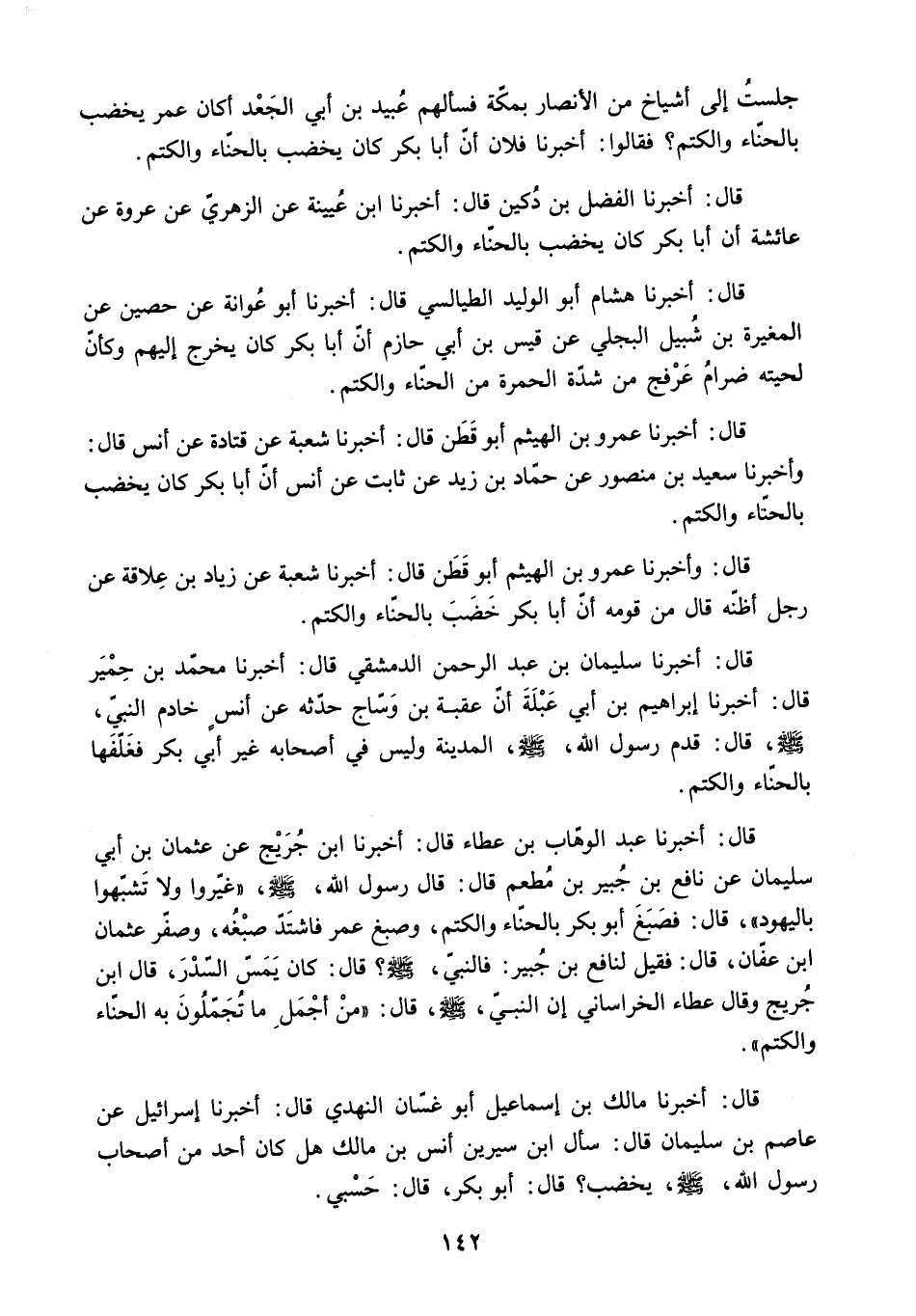 [قَالَ: أَخْبَرَنَا عَبْدُ الْوَهَّابِ بْنُ عَطَاءٍ قَالَ: أَخْبَرَنَا ابْنُ جُرَيْجٍ عَنْ عُثْمَانَ بْنِ أَبِي سُلَيْمَانَ عَنْ نَافِعِ بْنِ جُبَيْرِ بْنِ مُطْعِمٍ قَالَ: قَالَ رَسُولُ اللَّهِ - صَلَّى اللَّهُ عَلَيْهِ وَسَلَّمَ - غَيِّرُوا وَلا تَشَبَّهُوا بِالْيَهُودِ. قَالَ: فَصَبَغَ أَبُو بَكْرٍ بِالْحِنَّاءِ وَالْكَتَمِ. وَصَبَغَ عُمَرُ فَاشْتَدَّ صَبْغُهُ. وصفر عثمان ابن عفان. قال: فقيل لنافع بن جبير: فالنبي. ص؟ قَالَ: كَانَ يَمَسُّ السِّدْرَ. قَالَ ابْنُ جُرَيْجٍ وَقَالَ عَطَاءٌ الْخُرَاسَانِيُّ أَنَّ النَّبِيَّ - صَلَّى اللَّهُ عَلَيْهِ وَسَلَّمَ - قَالَ: مِنْ أَجْمَلِ مَا تُجَمِّلُونَ بِهِ الْحِنَّاءُ وَالْكَتَمُ] .