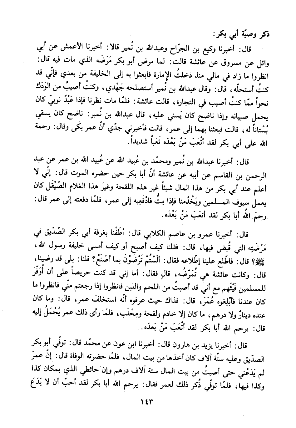 انْظُرُوا مَا زَادَ فِي مَالِي مُنْذُ دَخَلْتُ الإِمَارَةَ فَابْعَثُوا بِهِ إِلَى الْخَلِيفَةِ مِنْ بَعْدِي فَإِنِّي قَدْ كُنْتُ أَسْتَحِلُّهُ. قَالَ: وَقَالَ عَبْدُ اللَّهِ بْنُ نُمَيْرٍ أَسْتَصْلِحُهُ جَهْدِي. وَكُنْتُ أُصِيبُ مِنَ الْوَدَكِ نَحْوًا مِمَّا كُنْتُ أُصِيبُ فِي التِّجَارَةِ. قَالَتْ عَائِشَةُ: فَلَمَّا مَاتَ نَظَرْنَا فَإِذَا عَبْدٌ نُوبِيُّ كَانَ يَحْمِلُ صِبْيَانَهُ وَإِذَا نَاضِحٌ كَانَ يَسْنِي عَلَيْهِ. قَالَ عَبْدُ اللَّهِ بْنُ نُمَيْرٍ: نَاضِحٌ كَانَ يَسْقِي بُسْتَانًا لَهُ. قَالَتْ فَبَعَثْنَا بِهِمَا إِلَى عُمَرَ. قَالَتْ فَأَخْبَرَنِي جَدِّي أَنَّ عُمَرَ بَكَى وَقَالَ: رَحْمَةُ اللَّهِ عَلَى أَبِي بَكْرٍ لَقَدْ أَتْعَبَ مَنْ بَعْدَهُ تَعَبًا شَدِيدًا.