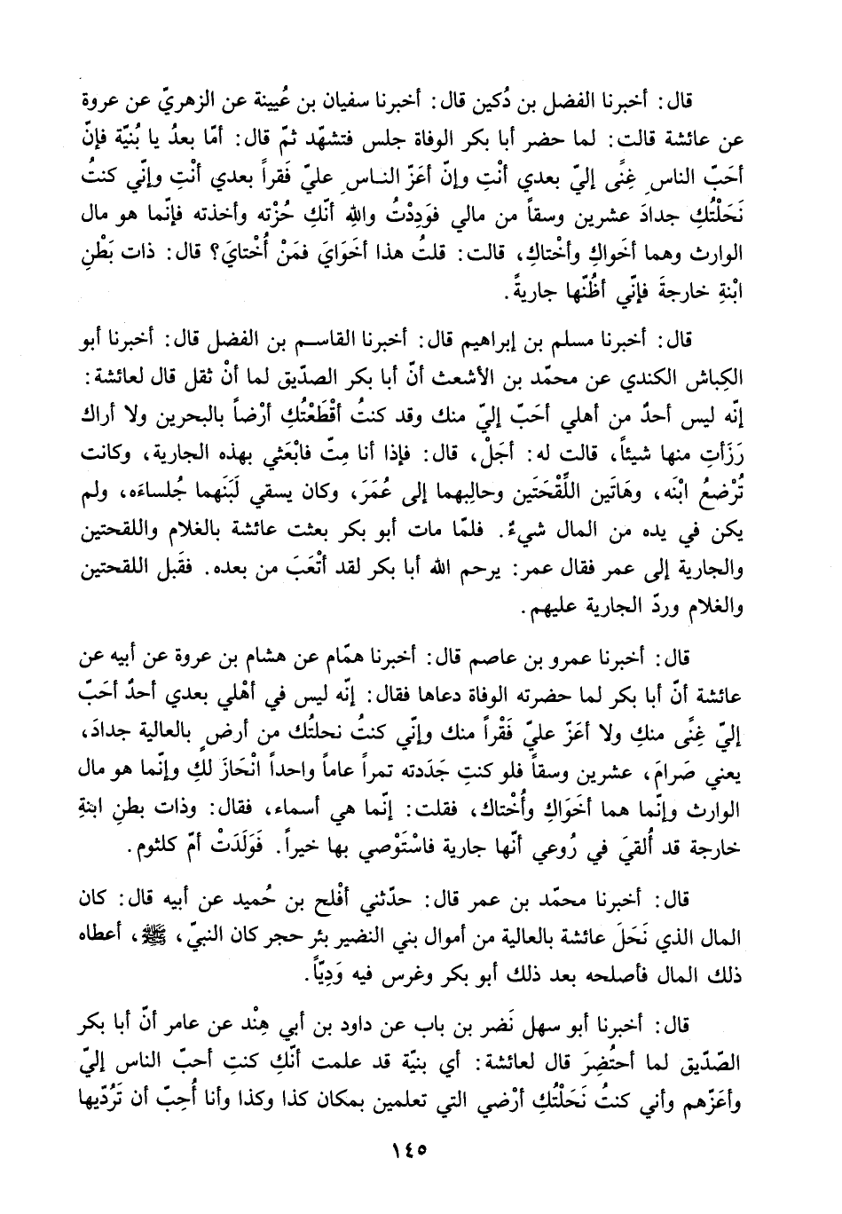 قَالَ: أَخْبَرَنَا الْفَضْلُ بْنُ دُكَيْنٍ قَالَ: أَخْبَرَنَا سُفْيَانُ بْنُ عُيَيْنَةَ عَنِ الزُّهْرِيِّ عَنْ عُرْوَةَ عَنْ عَائِشَةَ قَالَتْ: لَمَّا حَضَرَ أَبَا بَكْرٍ الْوَفَاةُ جَلَسَ فَتَشَهَّدَ ثُمَّ قَالَ: أَمَّا بَعْدُ يَا بُنَيَّةُ فَإِنَّ أَحَبَّ النَّاسِ غِنًى إِلَيَّ بَعْدِي أَنْتِ وَإِنَّ أَعَزَّ النَّاسِ عَلَيَّ فَقْرًا بَعْدِي أَنْتِ وَإِنِّي كُنْتُ نَحَلْتُكِ جِدَادَ عِشْرِينَ وَسْقًا مِنْ مَالِي فَوَدِدْتُ وَاللَّهِ أَنَّكِ حُزْتِهِ وَأَخَذْتِهِ فَإِنَّمَا هُوَ مَالُ الْوَارِثِ وَهُمَا أَخَوَاكِ وَأُخْتَاكِ. قَالَتْ: قُلْتُ هَذَا أَخَوَايَ فَمَنْ أُخْتَايَ؟ قَالَ: ذَاتُ بَطْنِ ابْنَةَ خَارِجَةَ فَإِنِّي أَظُنُّهَا جَارِيَةً.