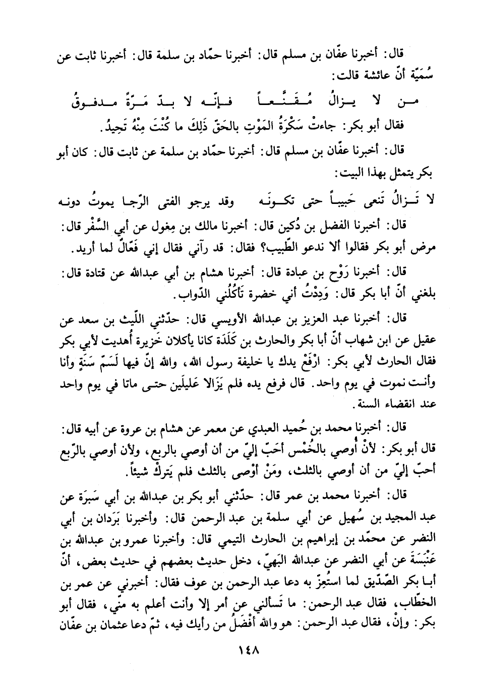 قَالَ: أَخْبَرَنَا عَفَّانُ بْنُ مُسْلِمٍ قَالَ: أَخْبَرَنَا حَمَّادُ بْنُ سَلَمَةَ عَنْ ثَابِتٍ قَالَ: كَانَ أَبُو بَكْرٍ يَتَمَثَّلُ بِهَذَا الْبَيْتِ: